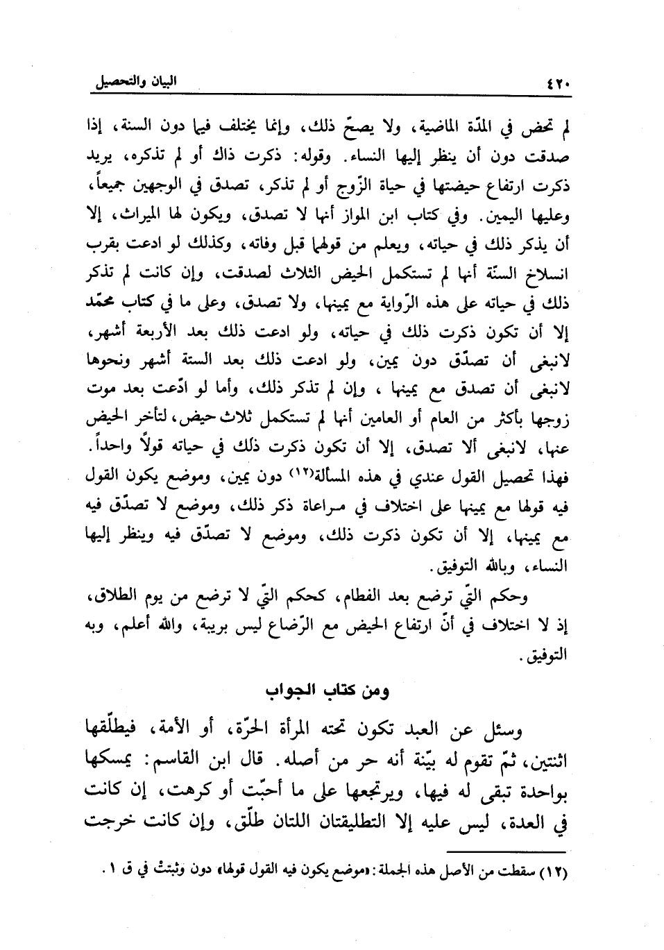 لم تحض في المدة الماضية، ولا يصح ذلك، وإنما يختلف فيما دون السنة، إذا صدقت دون أن ينظر إليها النساء. وقوله: ذكرت ذاك أو لم تذكره، يريد ذكرت ارتفاع حيضتها في حياة الزوج أو لم تذكر، تصدق في الوجهين جميعا، وعليها اليمين. وفي كتاب ابن المواز أنها لا تصدق، ويكون لها الميراث، إلا أن يذكر ذلك في حياته، ويعلم من قولهما قبل وفاته، وكذلك لو ادعت بقرب انسلاخ السنة أنها لم تستكمل الحيض الثلاث لصدقت، وإن كانت لم تذكر ذلك في حياته على هذه الرواية مع يمينها، ولا تصدق، وعلى ما في كتاب محمد إلا أن تكون ذكرت ذلك في حياته، ولو ادعت ذلك بعد الأربعة أشهر؛ لانبغى أن تصدق دون يمين، ولو ادعت ذلك بعد الستة أشهر ونحوها لانبغى أن تصدق مع يمينها، وإن لم تذكر ذلك، وأما لو ادعت بعد موت زوجها بأكثر من العام أو العامين أنها لم تستكمل ثلاث حيض، لتأخر الحيض عنها، لانبغى ألا تصدق، إلا أن تكون ذكرت ذلك في حياته قولا واحدا. فهذا تحصيل القول عندي في هذه المسألة دون يمين، وموضع يكون القول فيه قولها مع يمينها على اختلاف في مراعاة ذكر ذلك، وموضع لا تصدق فيه مع يمينها، إلا أن تكون ذكرت ذلك، وموضع لا تصدق فيه وينظر إليها النساء، وبالله التوفيق.