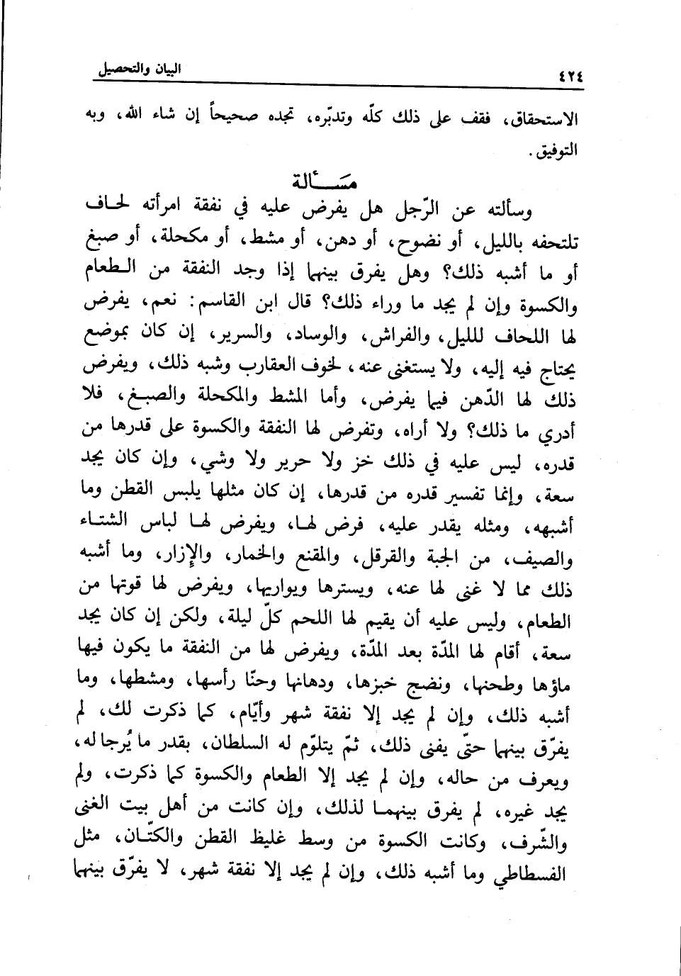 مسألة وسألته عن الرجل هل يفرض عليه في نفقة امرأته لحاف تلتحفه بالليل، أو نضوح، أو دهن، أو مشط، أو مكحلة، أو صبغ أو ما أشبه ذلك؟ وهل يفرق بينهما إذا وجد النفقة من الطعام والكسوة وإن لم يجد ما وراء ذلك؟ قال ابن القاسم: نعم، يفرض لها اللحاف للليل، والفراش، والوساد، والسرير، إن كان بموضع يحتاج فيه إليه، ولا يستغنى عنه، لخوف العقارب وشبه ذلك، ويفرض ذلك لها الدهن فيما يفرض، وأما المشط والمكحلة والصبغ، فلا أدري ما ذلك؟ ولا أراه، وتفرض لها النفقة والكسوة على قدرها من قدره، ليس عليه في ذلك خز ولا حرير ولا وشي، وإن كان يجد سعة، وإنما تفسير قدره من قدرها، إن كان مثلها يلبس القطن وما أشبهه، ومثله يقدر عليه، فرض لها، ويفرض لها لباس الشتاء والصيف، من الجبة والقرقل، والمقنع والخمار، والإزار، وما أشبه ذلك مما لا غنى لها عنه، ويسترها ويواريها، ويفرض لها قوتها من الطعام، وليس عليه أن يقيم لها اللحم كل ليلة، ولكن إن كان يجد سعة، أقام لها المدة بعد المدة، ويفرض لها من النفقة ما يكون فيها ماؤها وطحنها، ونضج خبزها، ودهانها وحنا رأسها، ومشطها، وما أشبه ذلك، وإن لم يجد إلا نفقة شهر وأيام، كما ذكرت لك، لم يفرق بينهما حتى يفنى ذلك، ثم يتلوم له السلطان، بقدر ما يرجى له، ويعرف من حاله، وإن لم يجد إلا الطعام والكسوة كما ذكرت، ولم يجد غيره، لم يفرق بينهما لذلك، وإن كانت من أهل بيت الغنى والشرف، وكانت الكسوة من وسط غليظ القطن والكتان، مثل الفسطاطي وما أشبه ذلك، وإن لم يجد إلا نفقة شهر، لا يفرق بينهما