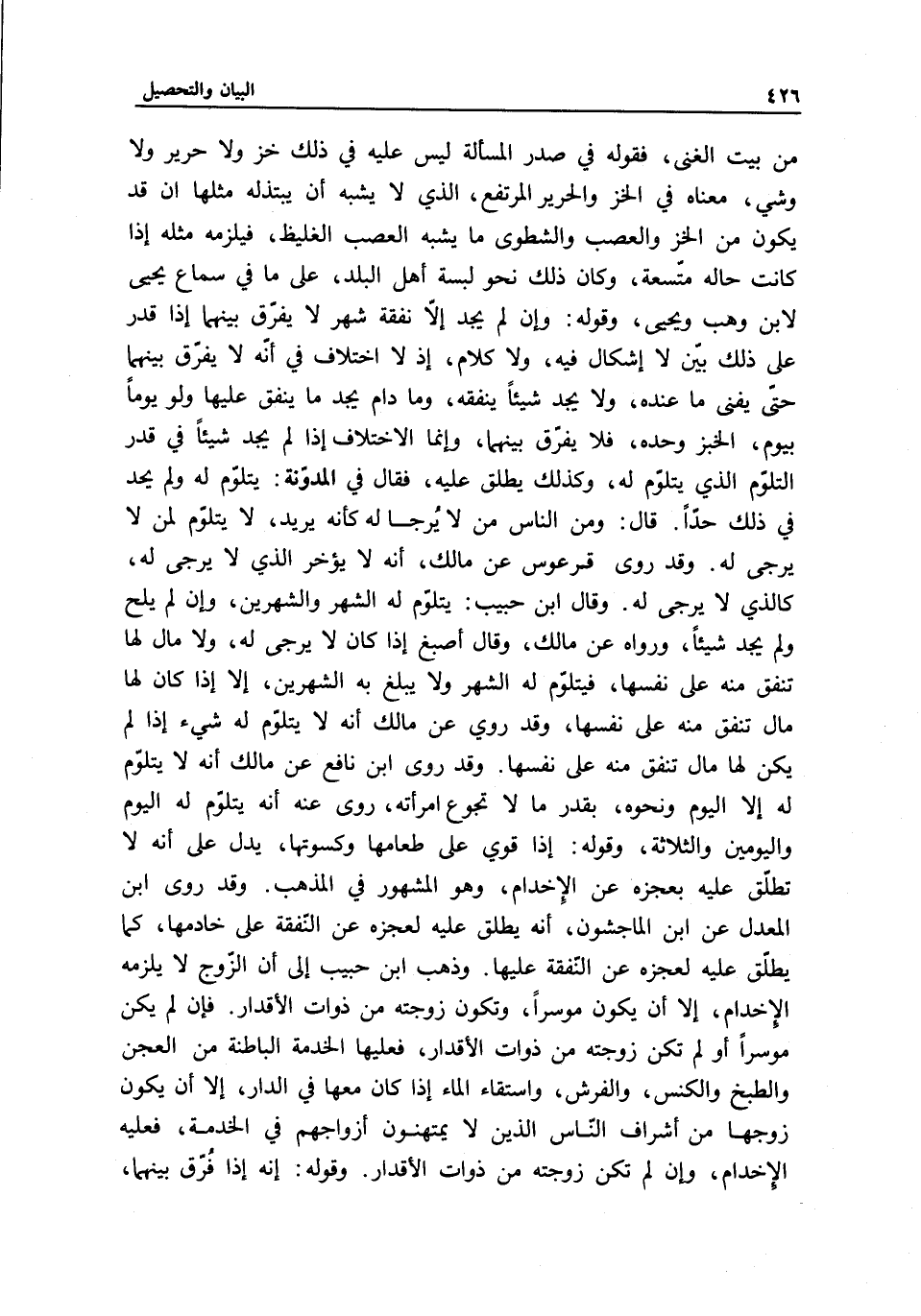 من بيت الغنى، فقوله في صدر المسألة ليس عليه في ذلك خز ولا حرير ولا وشي، معناه في الخز والحرير المرتفع، الذي لا يشبه أن يبتذله مثلها إن قد يكون من الخز والعصب والشطوى ما يشبه العصب الغليظ، فيلزمه مثله إذا كانت حاله متسعة، وكان ذلك نحو لبسة أهل البلد، على ما في سماع يحيى لابن وهب ويحيى، وقوله: وإن لم يجد إلا نفقة شهر لا يفرق بينهما إذا قدر على ذلك بين لا إشكال فيه، ولا كلام؛ إذ لا اختلاف في أنه لا يفرق بينهما حتى يفنى ما عنده، ولا يجد شيئا ينفقه، وما دام يجد ما ينفق عليها ولو يوما بيوم، الخبز وحده، فلا يفرق بينهما، وإنما الاختلاف إذا لم يجد شيئا في قدر التلوم الذي يتلوم له، وكذلك يطلق عليه، فقال في المدونة: يتلوم له ولم يحد في ذلك حدا. قال: ومن الناس من لا يرجى له كأنه يريد، لا يتلوم لمن لا يرجى له. وقد روى قرعوس عن مالك، أنه لا يؤخر الذي لا يرجى له، كالذي لا يرجى له. وقال ابن حبيب: يتلوم له الشهر والشهرين، وإن لم يلح ولم يجد شيئا، ورواه عن مالك، وقال أصبغ: إذا كان لا يرجى له، ولا مال لها تنفق منه على نفسها، فيتلوم له الشهر ولا يبلغ به الشهرين، إلا إذا كان لها مال تنفق منه على نفسها، وقد روي عن مالك أنه لا يتلوم له شيء إذا لم يكن لها مال تنفق منه على نفسها. وقد روى ابن نافع عن مالك أنه لا يتلوم له إلا اليوم ونحوه، بقدر ما لا تجوع امرأته، روى عنه أنه يتلوم له اليوم واليومين والثلاثة، وقوله: إذا قوي على طعامها وكسوتها، يدل على أنه لا تطلق عليه بعجزه عن الإخدام، وهو المشهور في المذهب. وقد روى ابن المعدل عن ابن الماجشون، أنه يطلق عليه لعجزه عن النفقة على خادمها، كما يطلق عليه لعجزه عن النفقة عليها. وذهب ابن حبيب إلى أن الزوج لا يلزمه الإخدام، إلا أن يكون موسرا، وتكون زوجته من ذوات الأقدار. فإن لم يكن موسرا أو لم تكن زوجته من ذوات الأقدار، فعليها الخدمة الباطنة من العجن والطبخ والكنس، والفرش، واستقاء الماء إذا كان معها في الدار، إلا أن يكون زوجها من أشراف الناس الذين لا يمتهنون أزواجهم في الخدمة، فعليه الإخدام، وإن لم تكن زوجته من ذوات الأقدار. وقوله: إنه إذا فرق بينهما،