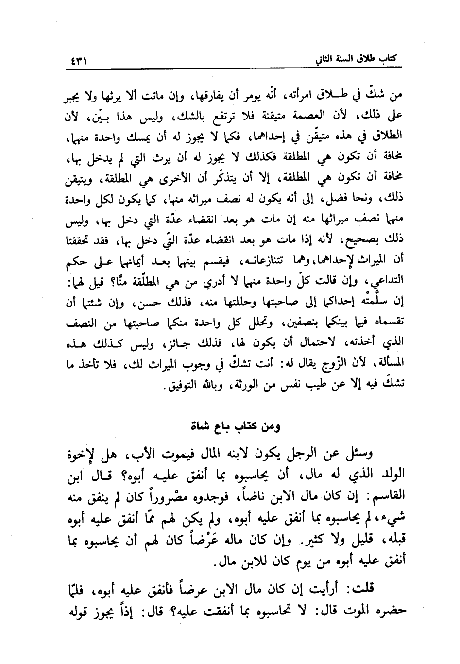 ومن كتاب باع شاة وسئل عن الرجل يكون لابنه المال فيموت الأب، هل لإخوة الولد الذي له مال، أن يحاسبوه بما أنفق عليه أبوه؟ قال ابن القاسم: إن كان مال الابن ناضا، فوجدوه مصرورا كان لم ينفق منه شيء، لم يحاسبوه بما أنفق عليه أبوه، ولم يكن لهم مما أنفق عليه أبوه قبله، قليل ولا كثير. وإن كان ماله عرضا كان لهم أن يحاسبوه بما أنفق عليه أبوه من يوم كان للابن مال.