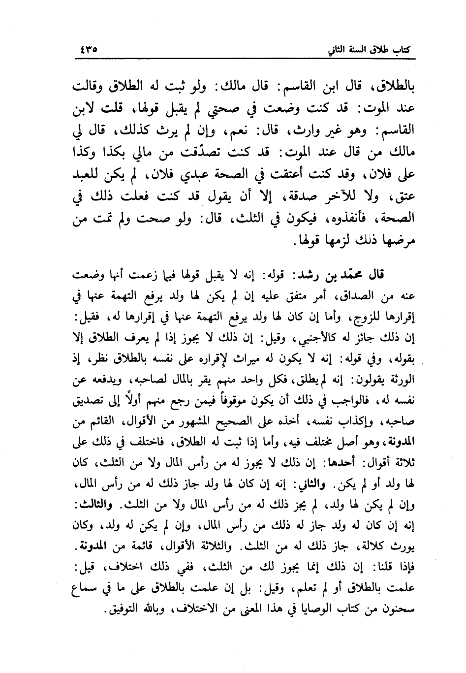 بالطلاق، قال ابن القاسم: قال مالك: ولو ثبت له الطلاق وقالت عند الموت: قد كنت وضعت في صحتي لم يقبل قولها، قلت لابن القاسم: وهو غير وارث، قال: نعم، وإن لم يرث كذلك، قال لي مالك: من قال عند الموت: قد كنت تصدقت من مالي بكذا وكذا على فلان، وقد كنت أعتقت في الصحة عبدي فلان، لم يكن للعبد عتق، ولا للآخر صدقة، إلا أن يقول: قد كنت فعلت ذلك في الصحة، فأنفذوه، فيكون في الثلث، قال: ولو صحت ولم تمت من مرضها ذلك لزمها قولها.