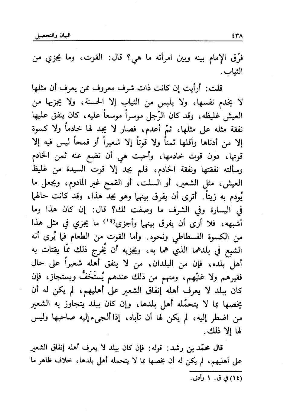قلت: أرأيت إن كانت ذات شرف معروف ممن يعرف أن مثلها لا يخدم نفسها، ولا يلبس من الثياب إلا الحسنة، ولا يجزيها من العيش غليظه، وقد كان الرجل موسرا موسعا عليه، كان ينفق عليها نفقة مثله على مثلها، ثم أعدم، فصار لا يجد لها خادما ولا كسوة إلا من أدناها وأقلها ثمنا ولا قوتا إلا شعيرا أو قمحا ليس فيه إلا قوتها، دون قوت خادمها، وأحبت هي أن تضع عنه ثمن الخادم وسألته نفقتها ونفقة الخادم، فلم يجد إلا قوت السيدة من غليظ العيش، مثل الشعير، أو السلت، أو القمح غير المادوم، ويجعل ما يودم به زيتا. أترى أن يفرق بينهما وهو يجد هذا، وقد كانت حالهما في اليسارة وفي الشرف ما وصفت لك؟ قال: إن كان هذا وما أشبهه، فلا أرى أن يفرق بينهما وأجزى ما يجزي في مثل هذا من الكسوة الفسطاطي ونحوه. وأما القوت من الطعام فما يرى أنه الشبع في بلدهما الذي هما به، ويجزيه أن يخرج ذلك مما يقتات به أهل بلده، فإن من البلدان، من لا ينفق أهله شعيرا على حال فقيرهم ولا غنيهم، ومنهم من ذلك عندهم يستخف ويستجاز، فإن كان ببلد لا يعرف أهله إنفاق الشعير على أهليهم، لم يكن له أن يخصها بما لا يتحمله أهل بلدها، وإن كان ببلد يتجاوز به الشعير من اضطر إليه، لم يكن لها أن تأباه، إذا ألجئ إليه صاحبها وليس لها إلا ذلك.