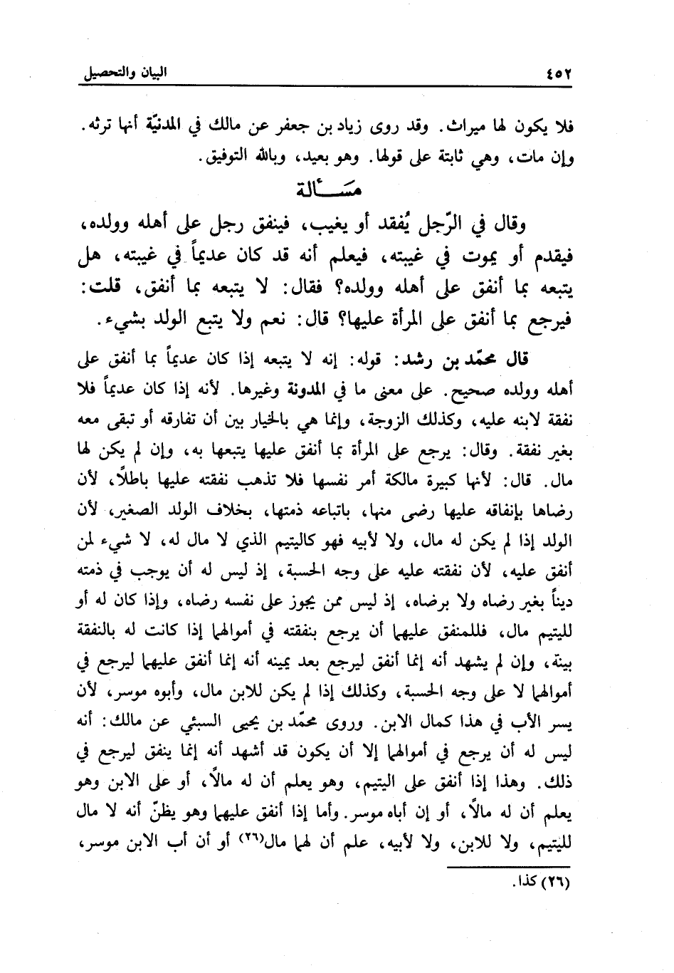 مسألة وقال في الرجل يفقد أو يغيب، فينفق رجل على أهله وولده، فيقدم أو يموت في غيبته، فيعلم أنه قد كان عديما في غيبته، هل يتبعه بما أنفق على أهله وولده؟ فقال: لا يتبعه بما أنفق، قلت: فيرجع بما أنفق على المرأة عليها؟ قال: نعم ولا يتبع الولد بشيء.