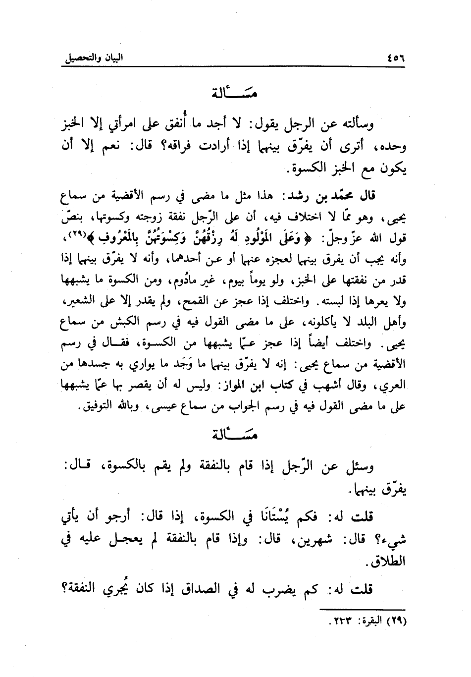 قال محمد بن رشد: هذا مثل ما مضى في رسم الأقضية من سماع يحيى، وهو مما لا اختلاف فيه، أن على الرجل نفقة زوجته وكسوتها، بنص قول الله عز وجل: {وَعَلَى الْمَوْلُودِ لَهُ رِزْقُهُنَّ وَكِسْوَتُهُنَّ بِالْمَعْرُوفِ} [البقرة: 233] ، وأنه يجب أن يفرق بينهما لعجزه عنهما أو عن أحدهما، وأنه لا يفرق بينهما إذا قدر من نفقتها على الخبز، ولو يوما بيوم، غير مادوم، ومن الكسوة ما يشبهها ولا يعرها إذا لبسته. واختلف إذا عجز عن القمح، ولم يقدر إلا على الشعير، وأهل البلد لا يأكلونه، على ما مضى القول فيه في رسم الكبش من سماع يحيى. واختلف أيضا إذا عجز عما يشبهها من الكسوة، فقال في رسم الأقضية من سماع يحيى: إنه لا يفرق بينهما ما وجد ما يواري به جسدها من العري، وقال أشهب في كتاب ابن المواز: وليس له أن يقصر بها عما يشبهها على ما مضى القول فيه في رسم الجواب من سماع عيسى، وبالله التوفيق.