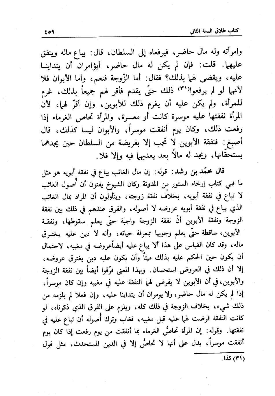 وامرأته وله مال حاضر، فيرفعاه إلى السلطان، قال: يباع ماله وينفق عليهما. قلت: فإن لم يكن له مال حاضر، أيؤمران أن يتداينا عليه، ويقضى لهما بذلك؟ فقال: أما الزوجة فنعم، وأما الأبوان فلا؛ لأنهما لو لم يرفعوا ذلك حتى يقدم فأقر لهم جميعا بذلك، غرم للمرأة، ولم يكن عليه أن يغرم ذلك للأبوين، وإن أقر لهما؛ لأن المرأة نفقتها عليه موسرة كانت أو معسرة، والمرأة تحاص الغرماء إذا رفعت ذلك، وكان يوم أنفقت موسرا، والأبوان ليسا كذلك، قال أصبغ: فنفقة الأبوين لا تجب إلا بفريضة من السلطان حين يجدهما يستحقانها، ويجد له مالا بعد يعديهما فيه وإلا فلا.