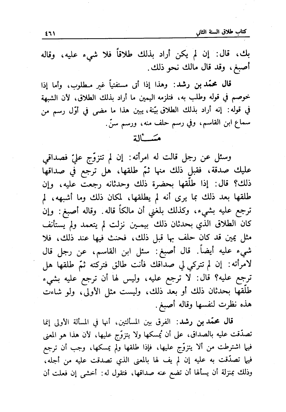 مسألة وسئل عن رجل قالت له امرأته: إن لم تتزوج علي فصداقي عليك صدقة، فقبل ذلك منها ثم طلقها، هل ترجع في صداقها ذلك؟ قال: إذا طلقها بحضرة ذلك وحدثانه رجعت عليه، وإن طلقها بعد ذلك بما يرى أنه لم يطلقها، لمكان ذلك وما أشبهه، لم ترجع عليه بشيء، وكذلك بلغني أن مالكا قاله. وقاله أصبغ، وإن كان الطلاق الذي بحدثان ذلك بيمين نزلت لم يتعمد ولم يستأنف مثل يمين قد كان حلف بها قبل ذلك، فحنث فيها عند ذلك، فلا شيء عليه أيضا. قال أصبغ: سئل ابن القاسم، عن رجل قال لامرأته: إن لم تتركي لي صداقك فأنت طالق فتركته ثم طلقها هل ترجع عليه؟ قال: لا ترجع عليه، وليس لها أن ترجع عليه بشيء طلقها بحدثان ذلك أو بعد ذلك، وليست مثل الأولى، ولو شاءت هذه نظرت لنفسها وقاله أصبغ.