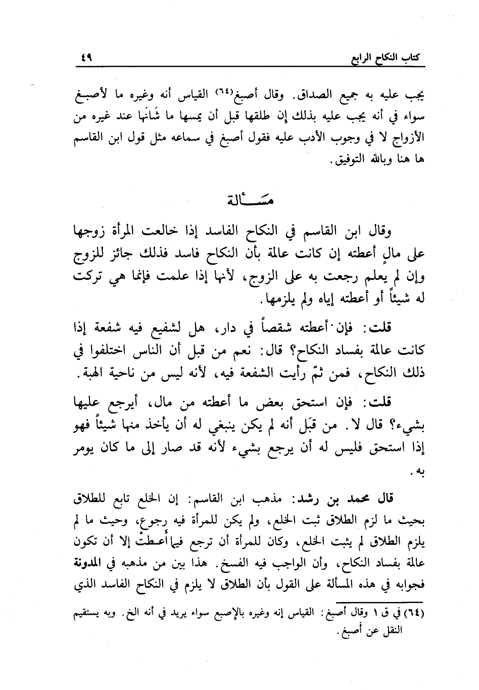قال محمد بن رشد: مذهب ابن القاسم: أن الخلع تابع للطلاق بحيث ما لزم الطلاق ثبت الخلع، ولم يكن للمرأة فيه رجوع، وحيث ما لم يلزم الطلاق لم يثبت الخلع، وكان للمرأة أن ترجع فيما أعطت إلا أن تكون عالمة بفساد النكاح، وأن الواجب فيه الفسخ. هذا بين من مذهبه في المدونة، فجوابه في هذه المسألة على القول بأن الطلاق لا يلزم في النكاح الفاسد الذي