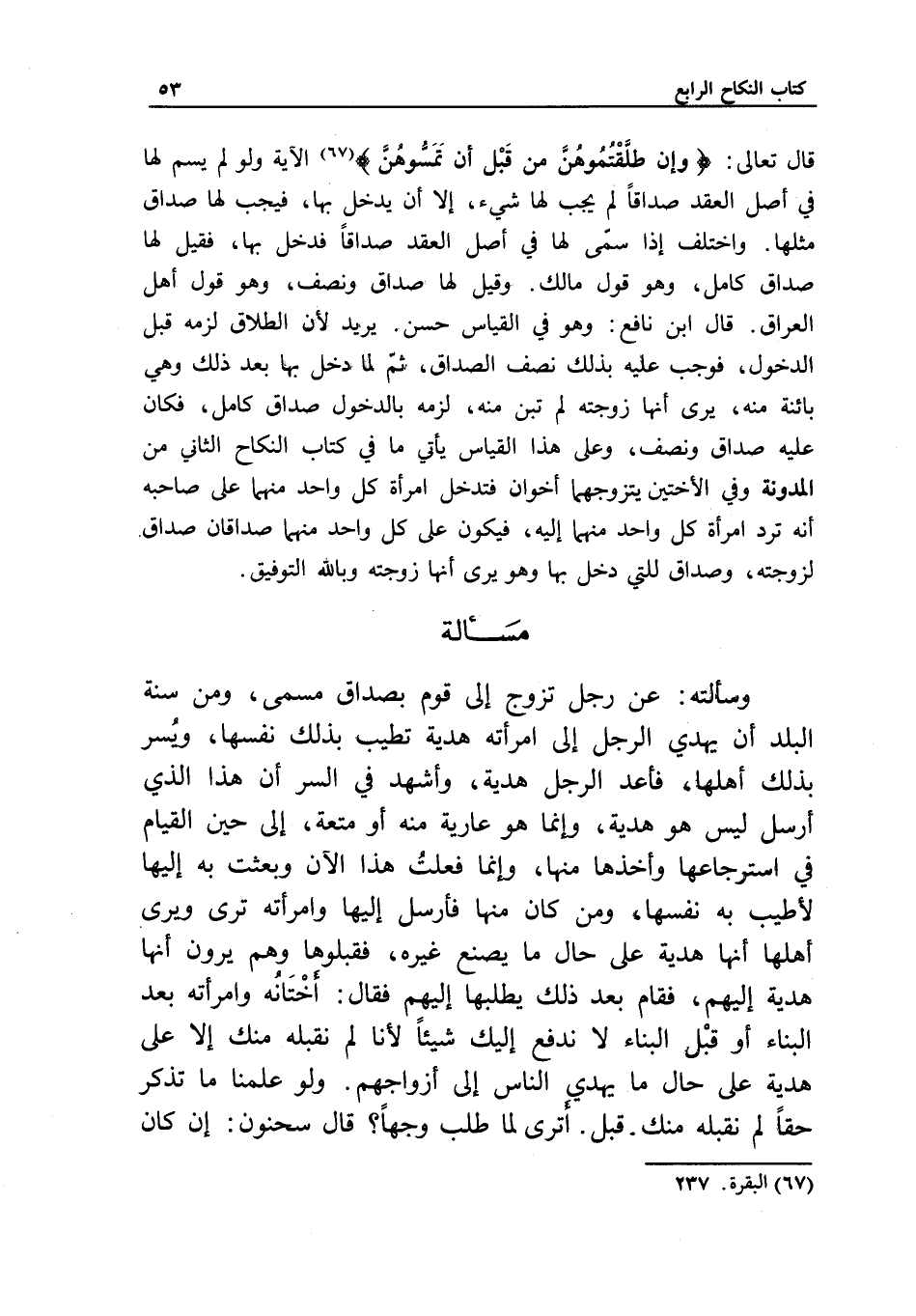 قال تعالى: {وَإِنْ طَلَّقْتُمُوهُنَّ مِنْ قَبْلِ أَنْ تَمَسُّوهُنَّ} [البقرة: 237] الآية، ولو لم يسم لها في أصل العقد صداقا لم يجب لها شيء، إلا أن يدخل بها، فيجب لها صداق مثلها. واختلف إذا سمّى لها في أصل العقد صداقا فدخل بها، فقيل: لها صداق كامل، وهو قول مالك. وقيل: لها صداق ونصف، وهو قول أهل العراق. قال ابن نافع: وهو في القياس حسن، يريد لأن الطلاق لزمه قبل الدخول، فوجب عليه بذلك نصف الصداق، ثم لما دخل بها بعد ذلك وهي بائنة منه، يرى أنها زوجته لم تبن منه، لزمه بالدخول صداق كامل، فكان عليه صداق ونصف، وعلى هذا القياس يأتي ما في كتاب النكاح الثاني من المدونة، وفي الأختين يتزوجهما أخوان فتدخل امرأة كل واحد منهما على صاحبه أنه ترد امرأة كل واحد منهما إليه، فيكون على كل واحد منهما صداقان: صداق لزوجته، وصداق للتي دخل بها وهو يرى أنها زوجته وبالله التوفيق.