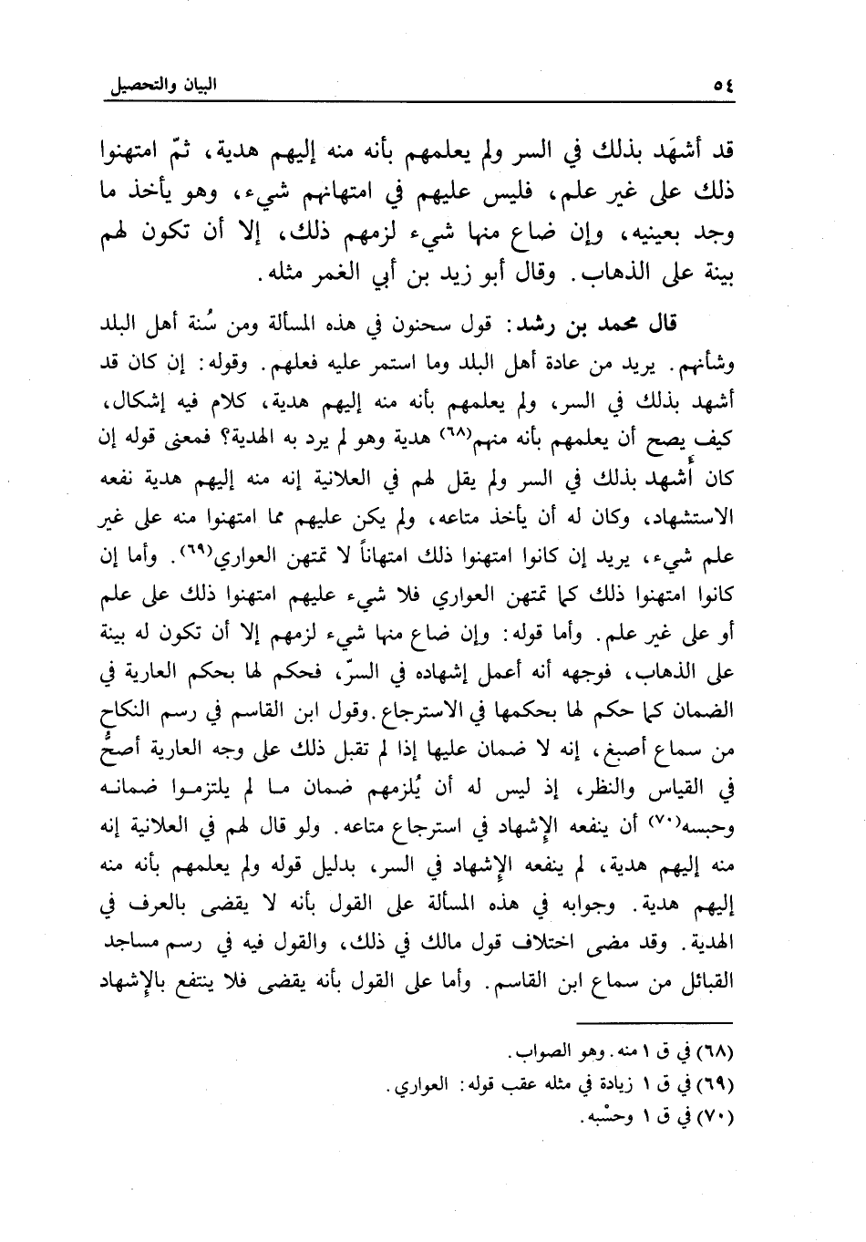 قال محمد بن رشد: قول سحنون في هذه المسألة: ومن سنة أهل البلد وشأنهم، يريد من عادة أهل البلد وما استمر عليه فعلهم. وقوله: إن كان قد أشهد بذلك في السر، ولم يعلمهم بأنه منه إليهم هدية، كلام فيه إشكال، كيف يصح أن يعلمهم بأنه منهم هدية وهو لم يرد به الهدية؟ فمعنى قوله: إن كان أشهد بذلك في السر ولم يقل لهم في العلانية إنه منه إليهم هدية نفعه الاستشهاد، وكان له أن يأخذ متاعه، ولم يكن عليهم مما امتهنوا منه على غير علم شيء، يريد إن كانوا امتهنوا ذلك امتهانا لا تمتهن العواري. وأما إن كانوا امتهنوا ذلك كما تمتهن العواري فلا شيء عليهم امتهنوا ذلك على علم أو على غير علم. وأما قوله: وإن ضاع منها شيء لزمهم إلا أن تكون له بينة على الذهاب، فوجهه أنه أعمل إشهاده في السر، فحكم لها بحكم العارية في الضمان كما حكم لها بحكمها في الاسترجاع. وقول ابن القاسم في رسم النكاح من سماع أصبغ، إنه لا ضمان عليها إذا لم تقبل ذلك على وجه العارية أصح في القياس والنظر، إذ ليس له أن يلزمهم ضمان ما لم يلتزموا ضمانه وحبسه أن ينفعه الإشهاد في استرجاع متاعه. ولو قال لهم في العلانية إنه منه إليهم هدية، لم ينفعه الإشهاد في السر، بدليل قوله: ولم يعلمهم بأنه منه إليهم هدية. وجوابه في هذه المسألة على القول بأنه لا يقضى بالعرف في الهدية. وقد مضى اختلاف قول مالك في ذلك، والقول فيه في رسم مساجد القبائل من سماع ابن القاسم. وأما على القول بأنه يقضى فلا ينتفع بالإشهاد