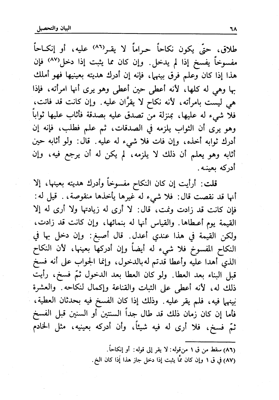 قلت: أرأيت إن كان النكاح مفسوخا وأدرك هديته بعينها، إلا أنها قد نقصت؟ قال: فلا شيء له غيرها يأخذها منقوصة. قيل له: فإن كانت قد زادت ونمت؟ قال: لا أرى له زيادتها، ولا أرى له إلا القيمة يوم أعطاها. والقياس أنها له بنمائها، وإن كانت قد زادت، ولكن القيمة في هذا عندي أعدل. قال أصبغ: وإن دخل بها في النكاح المفسوخ فلا شيء له أيضا وإن أدركها بعينها؛ لأن النكاح الذي أهدى عليه وأعطى قد تم له بالدخول، وإنما الجواب على أنه فسخ قبل البناء بعد العطاء. ولو كان العطاء بعد الدخول ثم فسخ، رأيت ذلك له؛ لأنه أعطى على الثبات والقناعة وإكمال لنكاحه. والعشرة بينهما فيه، فلم يقر عليه. وذلك إذا كان الفسخ فيه بحدثان العطية، فأما إن كان زمان ذلك قد طال جدا السنتين أو السنين قبل الفسخ ثم فسخ، فلا أرى له فيه شيئا، وإن أدركه بعينيه، مثل الخادم