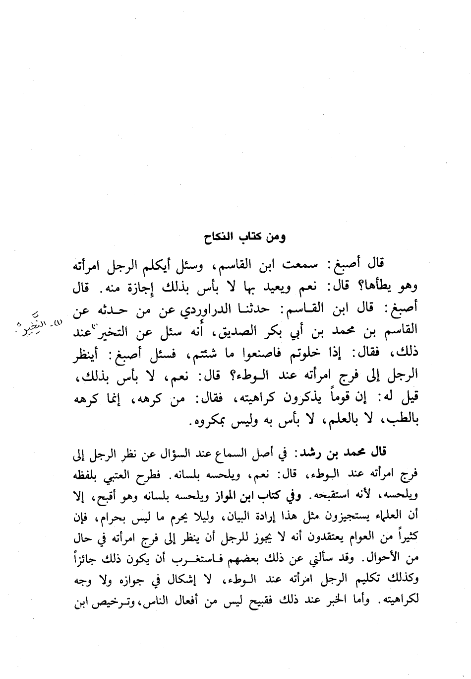 قال أصبغ: سمعت ابن القاسم، وسئل: أيكلم الرجل امرأته وهو يطأها؟ قال: نعم ويعيد بها، لا بأس بذلك إجازة منه. قال أصبغ: قال ابن القاسم: حدثنا الدراوردي عن من حدثه عن القاسم بن محمد بن أبي بكر الصديق، أنه سئل عن التخير عند ذلك، فقال: إذا خلوتم فاصنعوا ما شئتم، فسئل أصبغ: أينظر الرجل إلى فرج امرأته عند الوطء؟ قال: نعم، لا بأس بذلك، قيل له: إن قوما يذكرون كراهيته، فقال: من كرهه، إنما كرهه بالطب، لا بالعلم، لا بأس به وليس بمكروه.