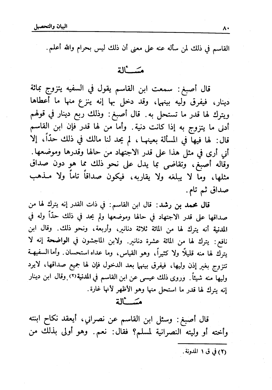 مسألة قال أصبغ: سمعت ابن القاسم يقول في السفيه يتزوج بمائة دينار، فيفرق وليه بينهما وقد دخل بها، إنه ينزع منها ما أعطاها، ويترك لها قدر ما تستحل به. قال أصبغ: وذلك ربع دينار في قولهم أدنى ما يتزوج به إذا كانت دنية. وأما من لها قدر فإن ابن القاسم قال: لها فيها في المسألة بعينها، لم يحد لنا مالك في ذلك حدا، إلا أني أرى في مثل هذا على قدر الاجتهاد من حالها وقدرها وموضعها. وقاله أصبغ، وتقاضى بما يدل على نحو ذلك مما هو دون صداق مثلها، وما لا يبلغه ولا يقاربه، فيكون صداقا تاما ولا مذهب صداق ثم تام.