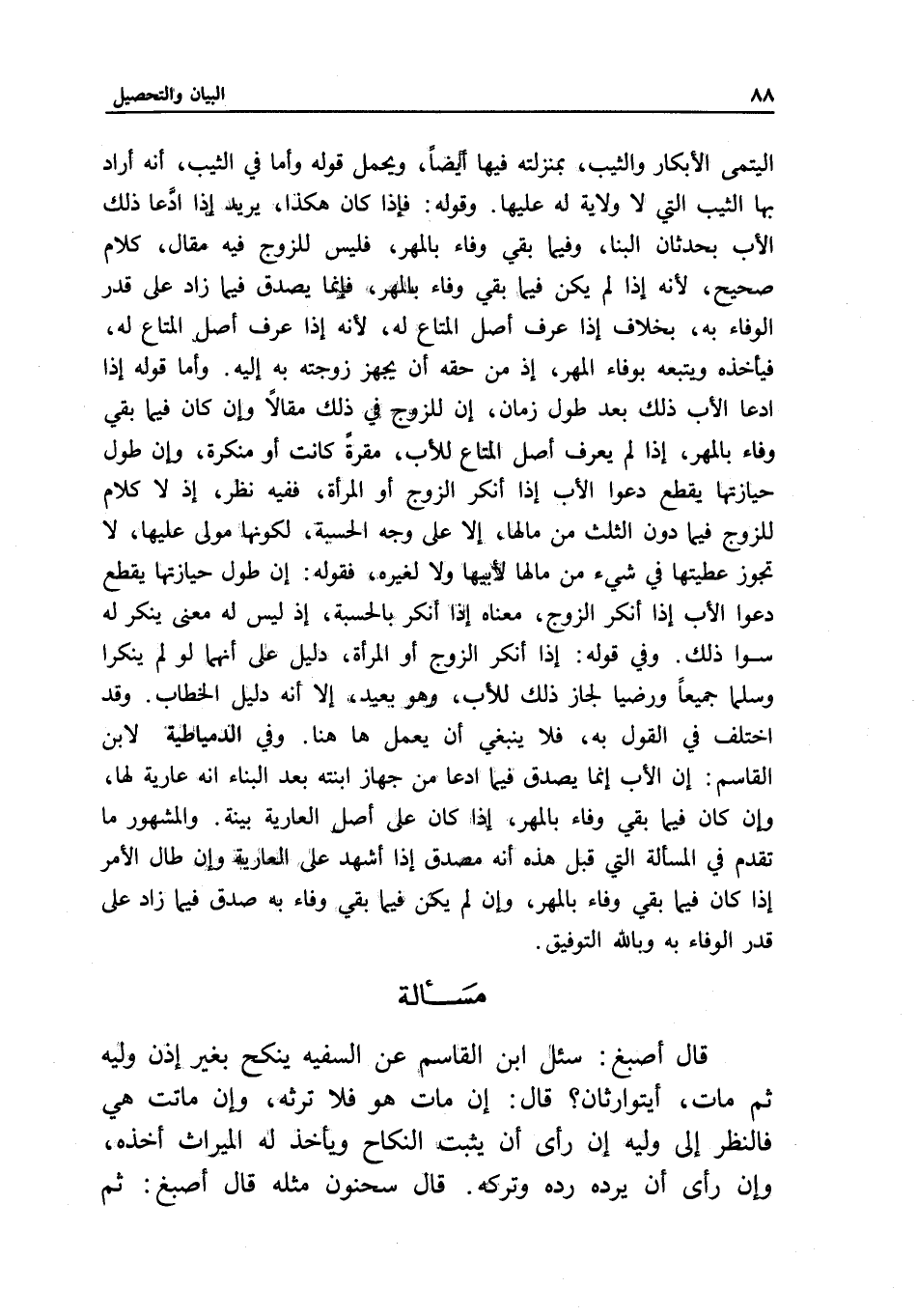 مسألة قال أصبغ: سئل ابن القاسم عن السفيه ينكح بغير إذن وليه ثم مات، أيتوارثان؟ قال: إن مات هو فلا ترثه، وإن ماتت هي فالنظر إلى وليه إن رأى أن يثبت النكاح ويأخذ له الميراث أخذه، وإن رأى أن يرده رده وتركه. قال سحنون مثله، قال أصبغ: ثم