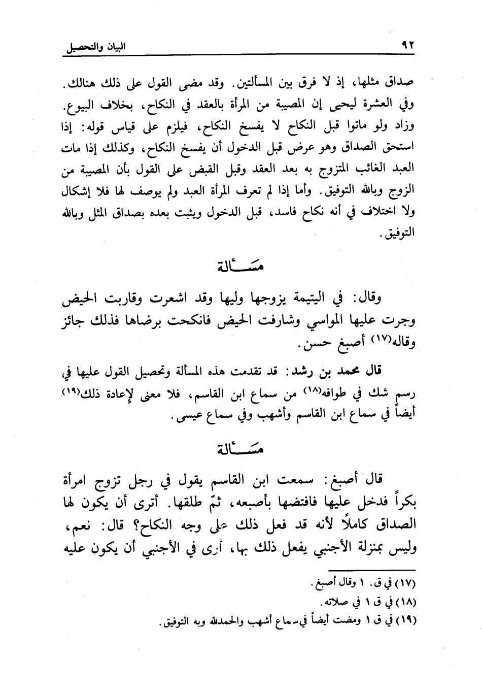 قال محمد بن رشد: قد تقدمت هذه المسألة، وتحصيل القول عليها في رسم شك في طوافه من سماع ابن القاسم، فلا معنى لإعادة ذلك أيضا في سماع ابن القاسم وأشهب وفي سماع عيسى.