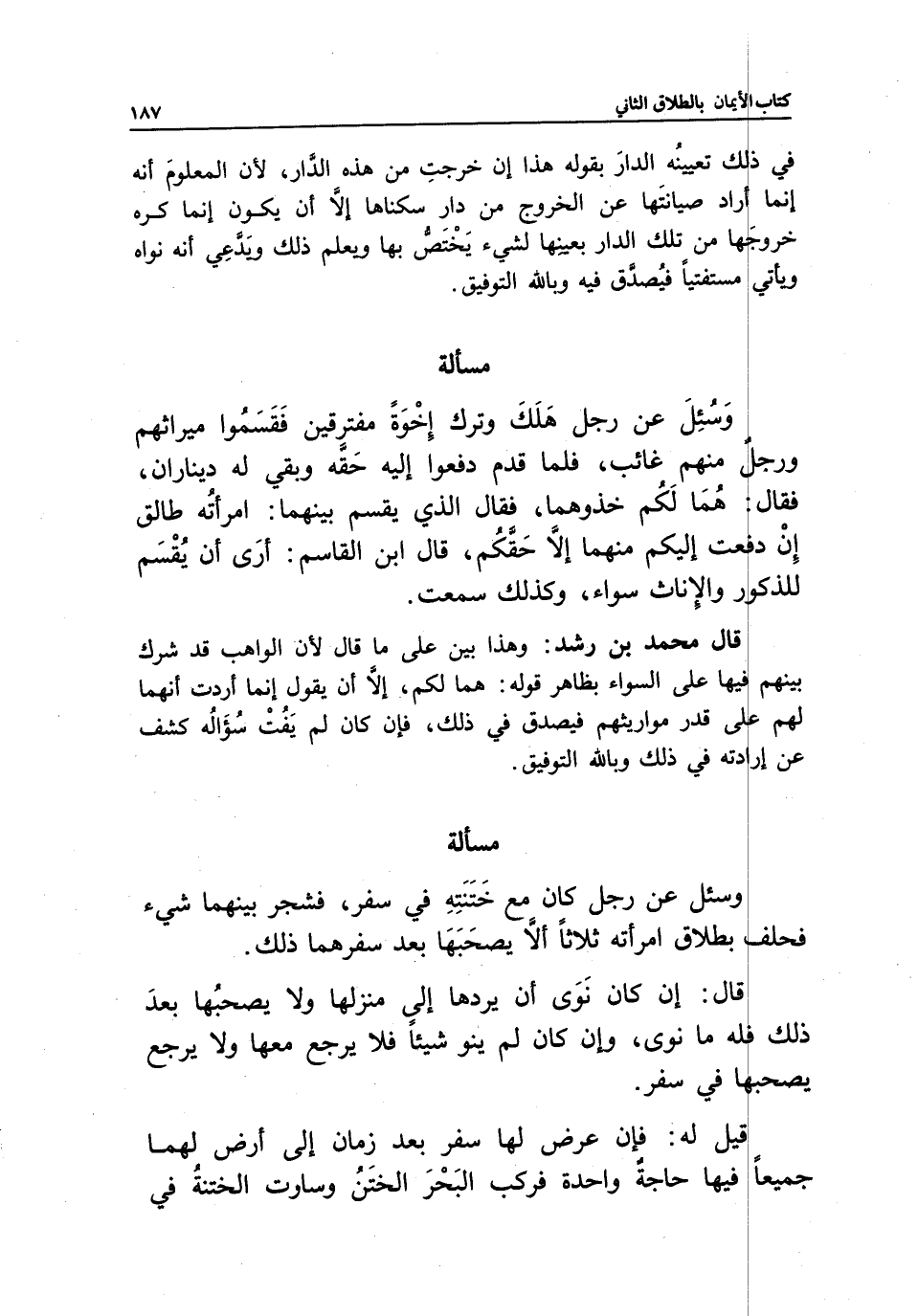 مسألة وسئل عن رجل هلك وترك إخوة مفترقين فقسموا ميراثهم ورجل منهم غائب، فلما قدم دفعوا إليه حقه وبقي له ديناران، فقال: هما لكم خذوهما، فقال الذي يقسم بينهما: امرأته طالق إن دفعت إليكم منهما إلا حقكم، قال ابن القاسم: أرى أن يقسم للذكور والإناث سواء، وكذلك سمعت.