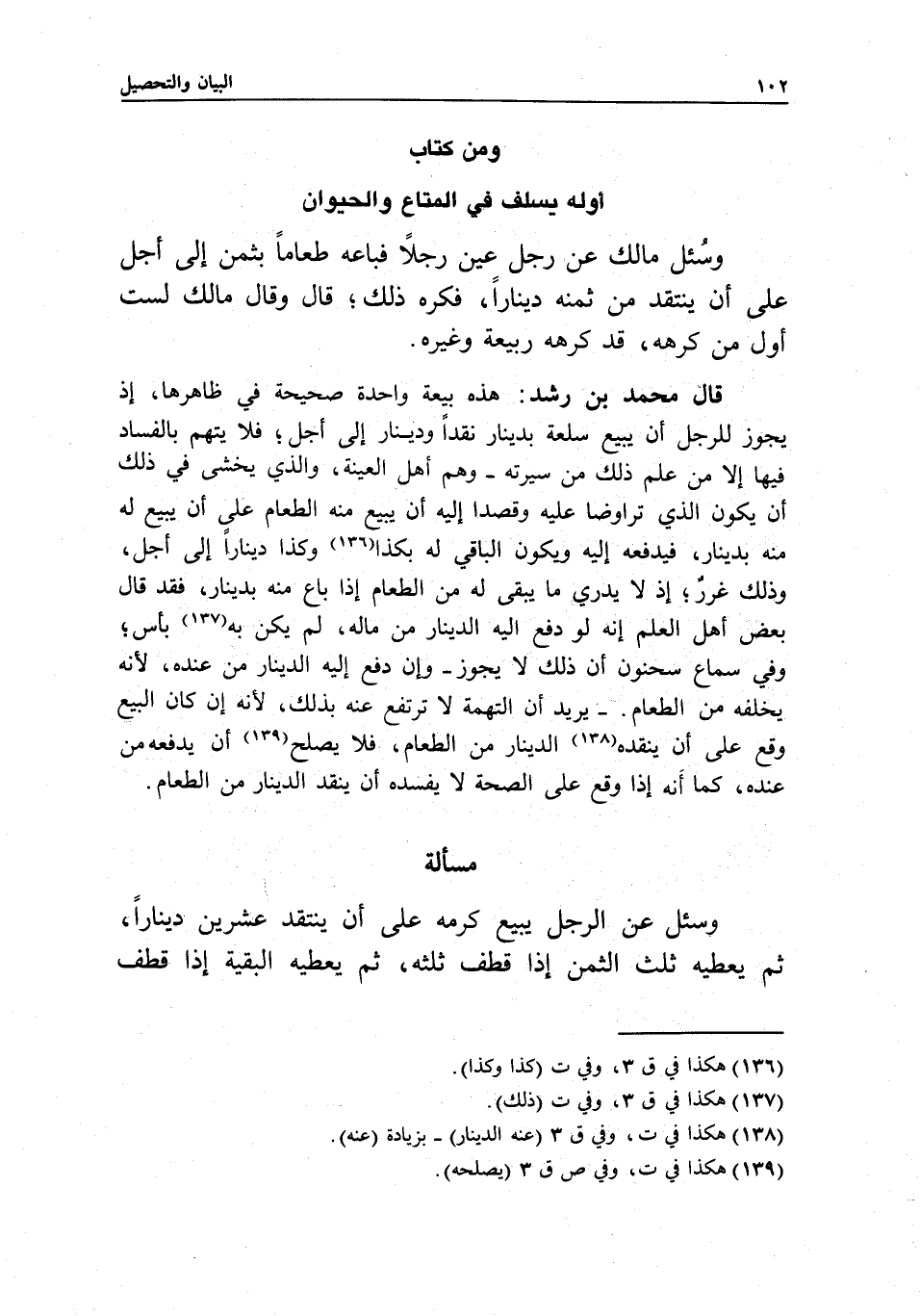 ومن كتاب أوله يسلف في المتاع والحيوان وسئل مالك: عن رجل عين رجلا فباعه طعاما بثمن إلى أجل، على أن ينتقد من ثمنه دينارا، فكره ذلك؛ قال: وقال مالك: لست أول من كرهه، قد كرهه ربيعة وغيره.