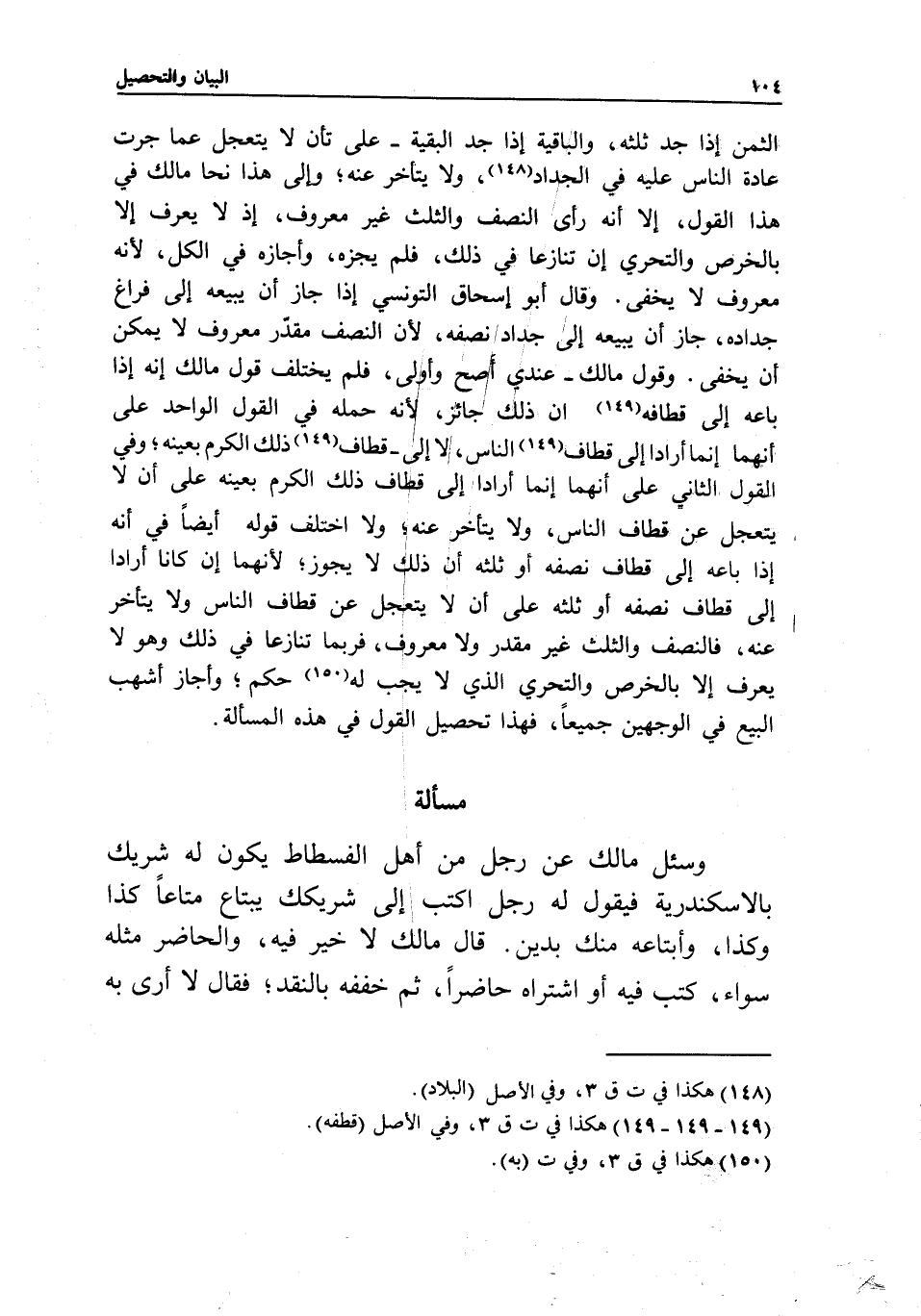 مسألة وسئل مالك: عن رجل من أهل الفسطاط يكون له شريك بالإسكندرية، فيقول له رجل: اكتب إلى شريكك يبتاع متاعا كذا وكذا، وأبتاعه منك بدين؟ قال مالك: لا خير فيه، والحاضر مثله سواء، كتب فيه أو اشتراه حاضرا، ثم خففه بالنقد؛ فقال: لا أرى به