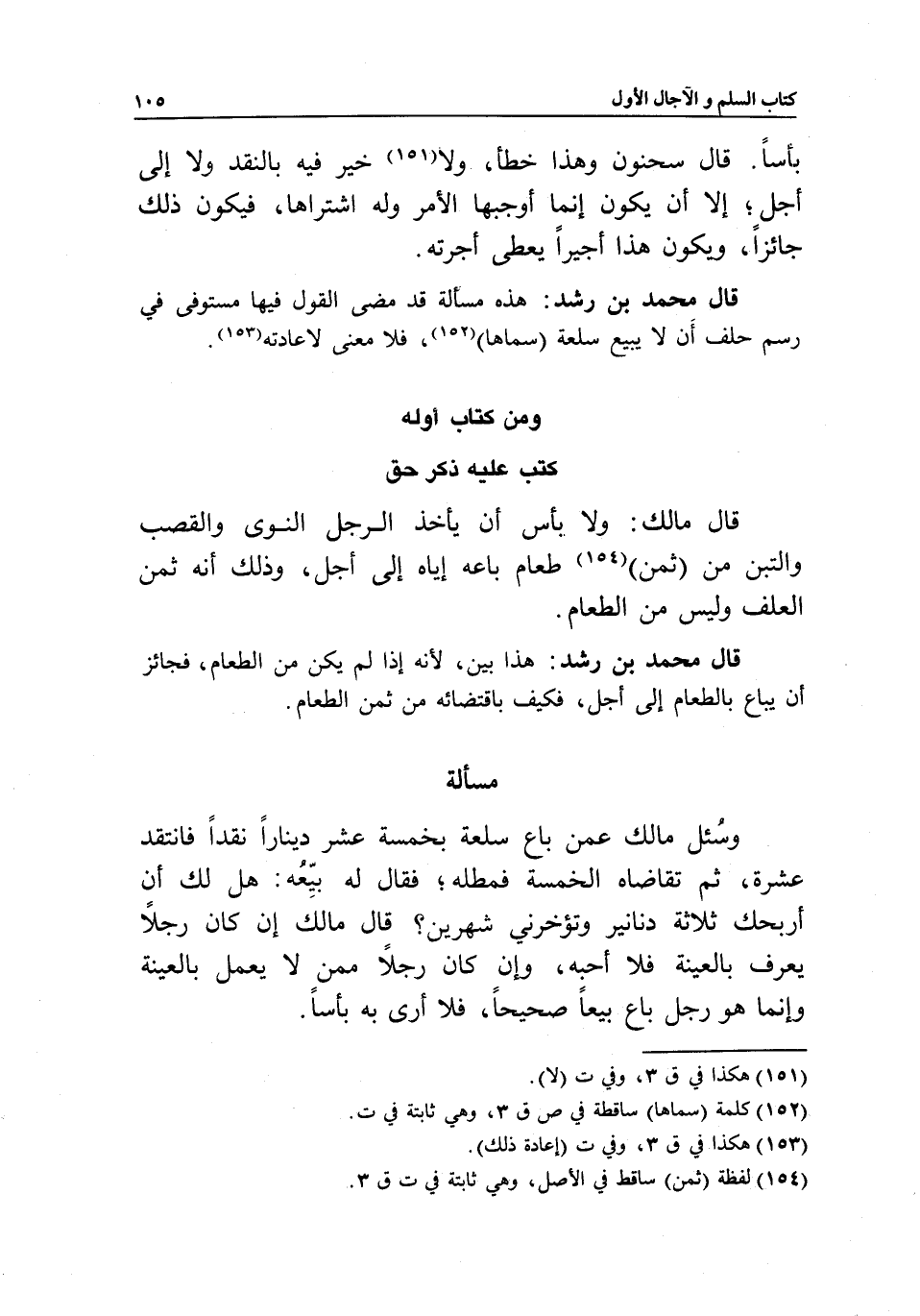 قال محمد بن رشد: هذه مسألة قد مضى القول فيها مستوفى في رسم حلف أن لا يبيع سلعة سماها، فلا معنى لإعادته.