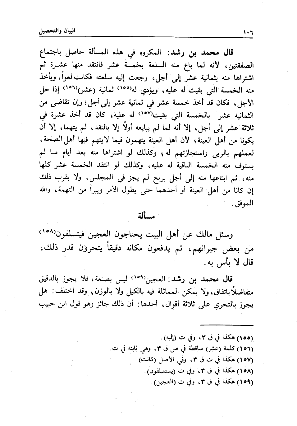 قال محمد بن رشد: المكروه في هذه المسألة حاصل باجتماع الصفقتين؛ لأنه لما باع منه السلعة بخمسة عشر فانتقد منها عشرة ثم اشتراها منه بثمانية عشر إلى أجل، رجعت إليه سلعته فكانت لغوا، ويأخذ منه الخمسة التي بقيت له عليه، ويؤدي له ثمانية عشر إذا حل الأجل، فكان قد أخذ خمسة عشر في ثمانية عشر إلى أجل؛ وإن تقاضى من الثمانية عشر بالخمسة التي بقيت له عليه، كان قد أخذ عشرة في ثلاثة عشر إلى أجل، إلا أنه لما لم يبايعه أولا إلا بالنقد، لم يتهما، إلا أن يكونا من أهل العينة؛ لأن أهل العينة يتهمون فيما لا يتهم فيها أهل الصحة، لعملهم بالربا واستجازتهم له؛ وكذلك لو اشتراها منه بعد أيام ما لم يستوف منه الخمسة الباقية له عليه، وكذلك لو انتقد الخمسة عشر كلها منه، ثم ابتاعها منه إلى أجل بربح لم يجز في المجلس، ولا بقرب ذلك إن كانا من أهل العينة أو أحدهما حتى يطول الأمر ويبرءا من التهمة، والله الموفق.