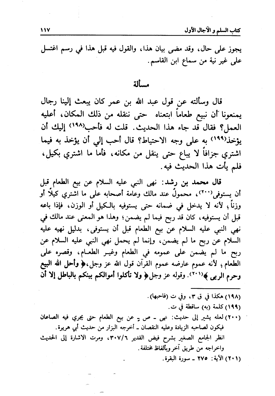 قال محمد بن رشد: «نهى النبي - عَلَيْهِ السَّلَامُ - عن بيع الطعام قبل أن يستوفى» ، محمول عند مالك وعامة أصحابه على ما اشتري كيلا أو وزنا؛ لأنه لا يدخل في ضمانه حتى يستوفيه بالكيل أو الوزن، فإذا باعه قبل أن يستوفيه، كان قد ربح فيما لم يضمن؛ وهذا هو المعنى عند مالك في «نهي النبي - عَلَيْهِ السَّلَامُ - عن بيع الطعام قبل أن يستوفى» بدليل «نهيه - عَلَيْهِ السَّلَامُ - عن ربح ما لم يضمن» وإنما لم يحمل «نهي النبي - عَلَيْهِ السَّلَامُ - عن ربح ما لم يضمن» على عمومه في الطعام وغير الطعام، وقصره على الطعام؛ لأنه عموم عارضه عموم القرآن، قول الله عز وجل: {وَأَحَلَّ اللَّهُ الْبَيْعَ وَحَرَّمَ الرِّبَا} [البقرة: 275] ، وقوله عز وجل: {لا تَأْكُلُوا أَمْوَالَكُمْ بَيْنَكُمْ بِالْبَاطِلِ إِلا أَنْ تَكُونَ تِجَارَةً عَنْ تَرَاضٍ مِنْكُمْ} [النساء: 29] ،