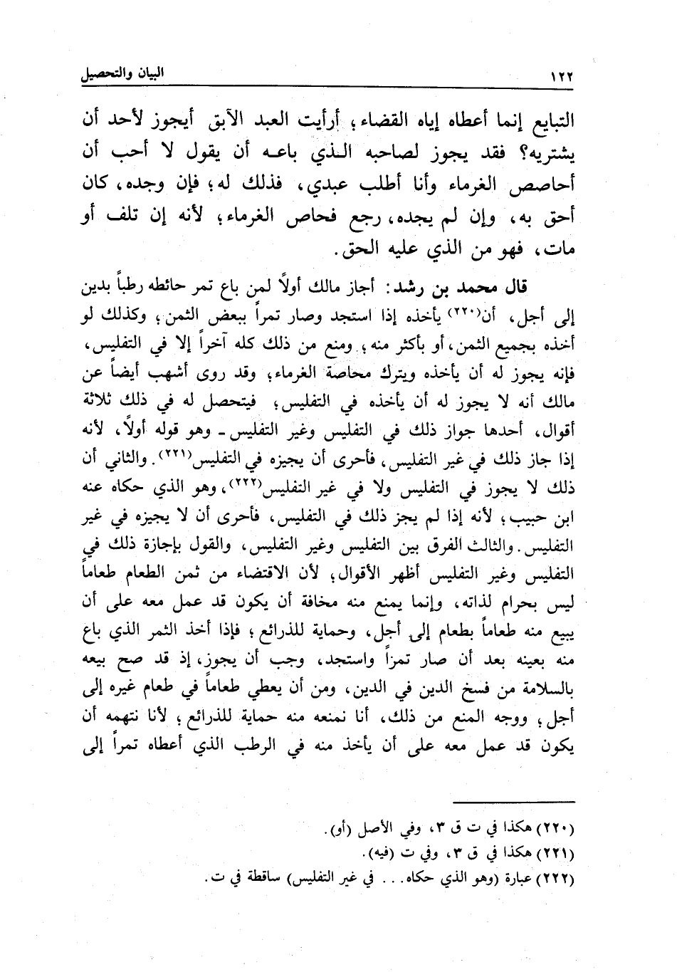 قال محمد بن رشد: أجاز مالك أولا لمن باع تمر حائطه رطبا بدين إلى أجل، أن يأخذه إذا استجد وصار تمرا ببعض الثمن؛ وكذلك لو أخذه بجميع الثمن، أو بأكثر منه، ومنع من ذلك كله آخرا إلا في التفليس، فإنه يجوز له أن يأخذه ويترك محاصة الغرماء؛ وقد روى أشهب أيضا عن مالك أنه لا يجوز له أن يأخذه في التفليس؛ فيتحصل له في ذلك ثلاثة أقوال: أحدها: جواز ذلك في التفليس وغير التفليس، وهو قوله أولا؛ لأنه إذا جاز ذلك في غير التفليس، فأحرى أن يجيزه في التفليس. والثاني: أن ذلك لا يجوز في التفليس ولا في غير التفليس، وهو الذي حكاه عنه ابن حبيب؛ لأنه إذا لم يجز ذلك في التفليس، فأحرى أن لا يجيزه في غير التفليس. والثالث: الفرق بين التفليس وغير التفليس، والقول بإجازة ذلك في التفليس وغير التفليس أظهر الأقوال؛ لأن الاقتضاء من ثمن الطعام طعاما ليس بحرام لذاته، وإنما يمنع منه مخافة أن يكون قد عمل معه على أن يبيع منه طعاما بطعام إلى أجل، وحماية للذرائع، فإذا أخذ الثمر الذي باع منه بعينه بعد أن صار تمرا واستجد، وجب أن يجوز، إذ قد صح بيعه بالسلامة من فسخ الدين في الدين، ومن أن يعطي طعاما في طعام غيره إلى أجل. ووجه المنع من ذلك: أنا نمنعه منه حماية للذرائع؛ لأنا نتهمه أن يكون قد عمل معه على أن يأخذ منه في الرطب الذي أعطاه تمرا إلى