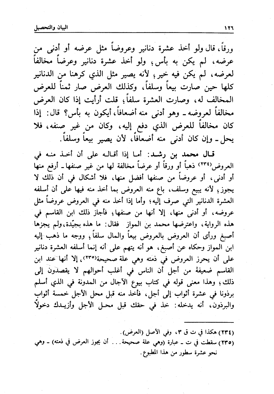 واعترضها محمد بن المواز، فقال: ما هذه بجيدة، ولم يجزها أصبغ ورأى أن العروض بالعروض بيعا والمال سلفا. ووجه ما ذهب إليه ابن المواز وحكاه عن أصبغ: هو أنه يتهم على أنه إنما أسلفه العشرة دنانير على أن يحرز العروض في ذمته، وهي علة صحيحة، إلا أنها عند ابن القاسم ضعيفة من أجل أن الناس في أغلب أحوالهم لا يقصدون إلى ذلك؛ وهذا معنى قوله في كتاب بيوع الآجال من المدونة في الذي أسلم برذونا في عشرة أثواب إلى أجل، فأخذ منه قبل محل الأجل خمسة أثواب والبرذون، أنه يدخله: خذ في حقك قبل محل الأجل وأزيدك دخولا