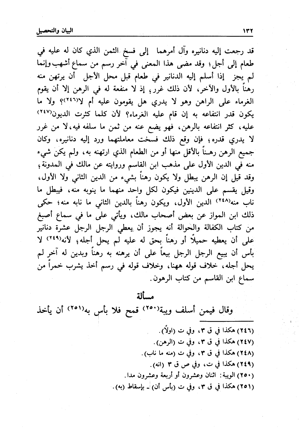 قد رجعت إليه دنانيره وآل أمرهما إلى فسخ الثمن الذي كان له عليه في طعام إلى أجل، وقد مضى هذا المعنى في آخر رسم من سماع أشهب، وإنما لم يجز إذا أسلم إليه الدنانير في طعام قبل محل الأجل أن يرتهن منه رهنا بالأول والآخر؛ لأن ذلك غرر؛ إذ لا منفعة له في الرهن إلا أن يقوم الغرماء على الراهن وهو لا يدري هل يقومون عليه أم لا؛ ولا ما يكون قدر انتفاعه به إن قام عليه الغرماء؛ لأن كلما كثرت الديون عليه، كثر انتفاعه بالرهن، فهو يضع عنه من ثمن ما سلفه فيه، لا من غرر لا يدري قدره؛ فإن وقع ذلك فسخت معاملتهما ورد إليه دنانيره، وكان جميع الرهن رهنا بالأقل منها أو من الطعام الذي ارتهنه به، ولم يكن شيء منه في الدين الأول على مذهب ابن القاسم وروايته عن مالك في المدونة.
