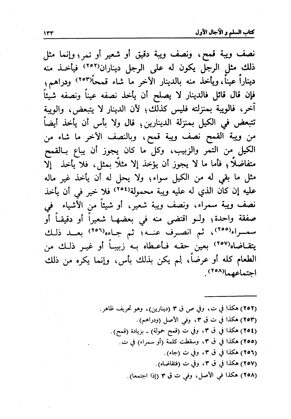 نصف ويبة قمح، ونصف ويبة دقيق أو شعير أو تمر؛ وإنما مثل ذلك مثل الرجل يكون له على الرجل ديناران فيأخذ منه دينارا عينا، ويأخذ منه بالدينار الآخر ما شاء قمحا ودراهم؛ فإن قال قائل: فالدينار لا يصلح أن يأخذ نصفه عينا ونصفه شيئا آخر، فالويبة بمنزلته فليس كذلك؛ لأن الدينار لا يتبعض، والويبة تتبعض في الكيل بمنزلة الدينارين.