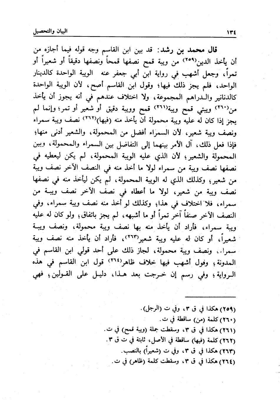 قال محمد بن رشد: قد بين ابن القاسم وجه قوله فيما أجازه من أن يأخذ الدين من ويبة قمح نصفها قمحا ونصفها دقيقا أو شعيرا أو تمرا، وجعل أشهب في رواية ابن أبي جعفر عنه الويبة الواحدة كالدينار الواحد، فلم يجز ذلك فيها؛ وقول ابن القاسم أصح؛ لأن الويبة الواحدة كالدنانير والدراهم المجموعة، ولا اختلاف عندهم في أنه يجوز أن يأخذ من ويبتي قمح ويبة قمح وويبة دقيق أو شعير أو تمر؛ وإنما لم يجز إذا كان له عليه ويبة محمولة أن يأخذ منه فيها نصف ويبة سمراء ونصف ويبة شعير؛ لأن السمراء أفضل من المحمولة، والشعير أدنى منها، فإذا فعل ذلك، آل الأمر بينهما إلى التفاضل بين السمراء والمحمولة، وبين المحمولة والشعير؛ لأن الذي عليه الويبة المحمولة، لم يكن ليعطيه في نصفها نصف ويبة من سمراء، لولا ما أخذ منه في النصف الآخر نصف ويبة من شعير.