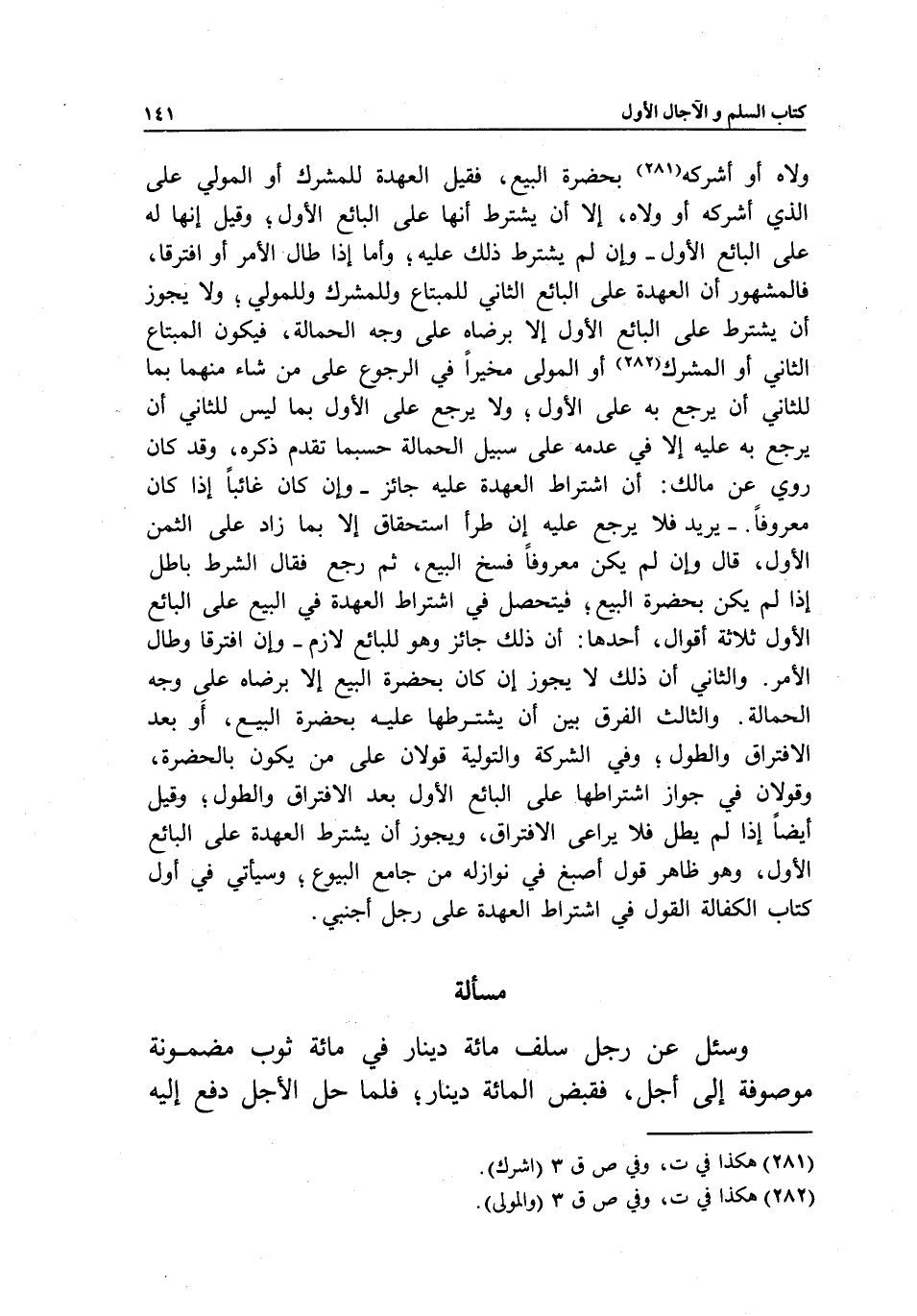يريد فلا يرجع عليه إن طرأ استحقاق إلا بما زاد على الثمن الأول، قال: وإن لم يكن معروفا فسخ البيع، ثم رجع فقال الشرط باطل إذا لم يكن بحضرة البيع؛ فيتحصل في اشتراط العهدة في البيع على البائع الأول ثلاثة أقوال، أحدها: أن ذلك جائز وهو للبائع لازم- وإن افترقا وطال الأمر. والثاني أن ذلك لا يجوز إن كان بحضرة البيع إلا برضاه على وجه الحمالة. والثالث الفرق بين أن يشترطها عليه بحضرة البيع، أو بعد الافتراق والطول؛ وفي الشركة والتولية قولان على من يكون بالحضرة، وقولان في جواز اشتراطها على البائع الأول بعد الافتراق والطول؛ وقيل أيضا إذا لم يطل فلا يراعى الافتراق، ويجوز أن يشترط العهدة على البائع الأول، وهو ظاهر قول أصبغ في نوازله من جامع البيوع؛ وسيأتي في أول كتاب الكفالة القول في اشتراط العهدة على رجل أجنبي.