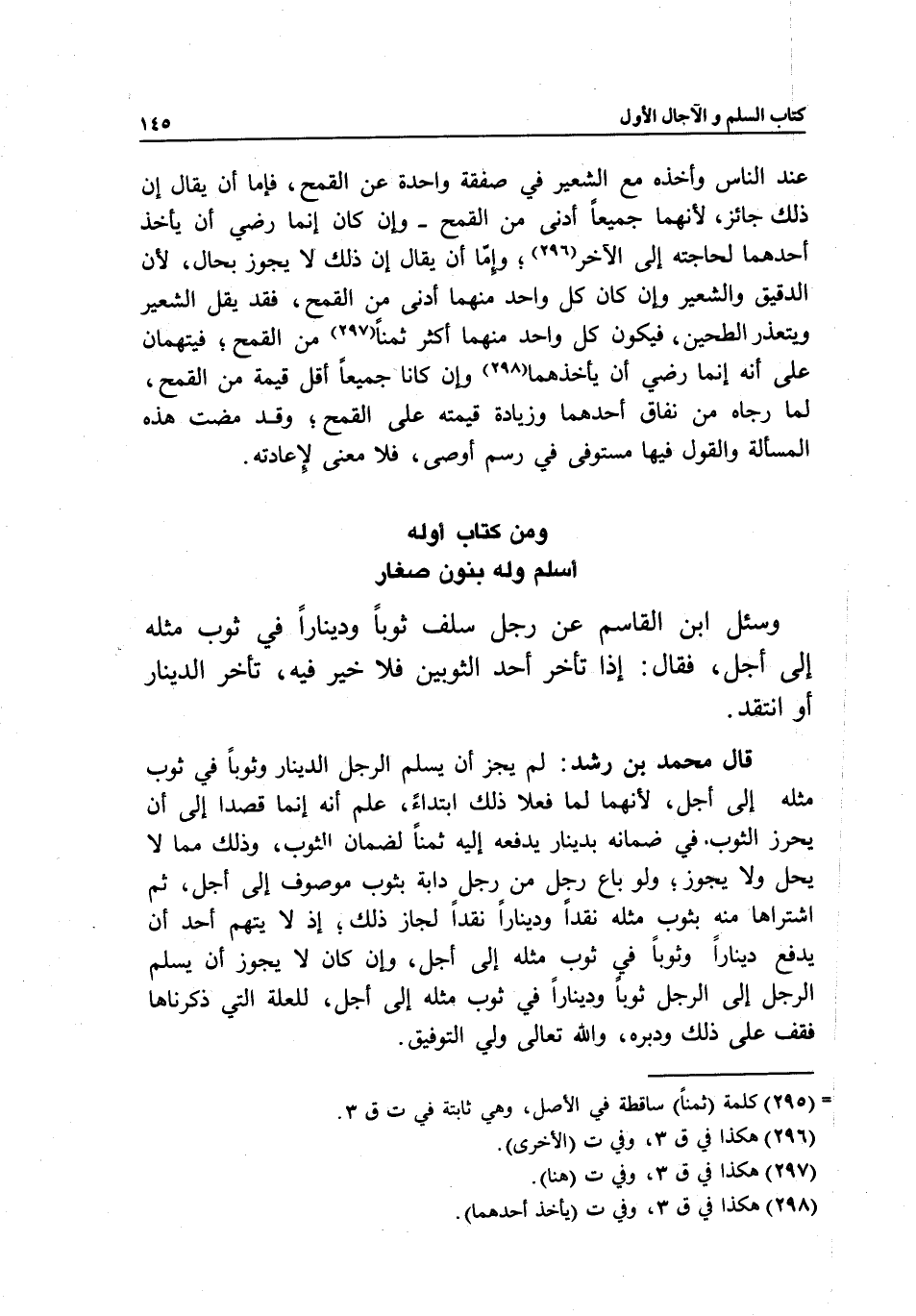 عند الناس وأخذه مع الشعير في صفقة واحدة عن القمح، فإما أن يقال إن ذلك جائز؛ لأنهما جميعا أدنى من القمح- وإن كان إنما رضي أن يأخذ أحدهما لحاجته إلى الآخر، وإما أن يقال إن ذلك لا يجوز بحال؛ لأن الدقيق والشعير وإن كان كل واحد منهما أدنى من القمح، فقد يقل الشعير ويتعذر الطحين، فيكون كل واحد منهما أكثر ثمنا من القمح، فيتهمان على أنه إنما رضي أن يأخذهما وإن كانا جميعا أقل قيمة من القمح، لما رجاه من نفاق أحدهما وزيادة قيمته على القمح؛ وقد مضت هذه المسألة والقول فيها مستوفى في رسم أوصى، فلا معنى لإعادته.