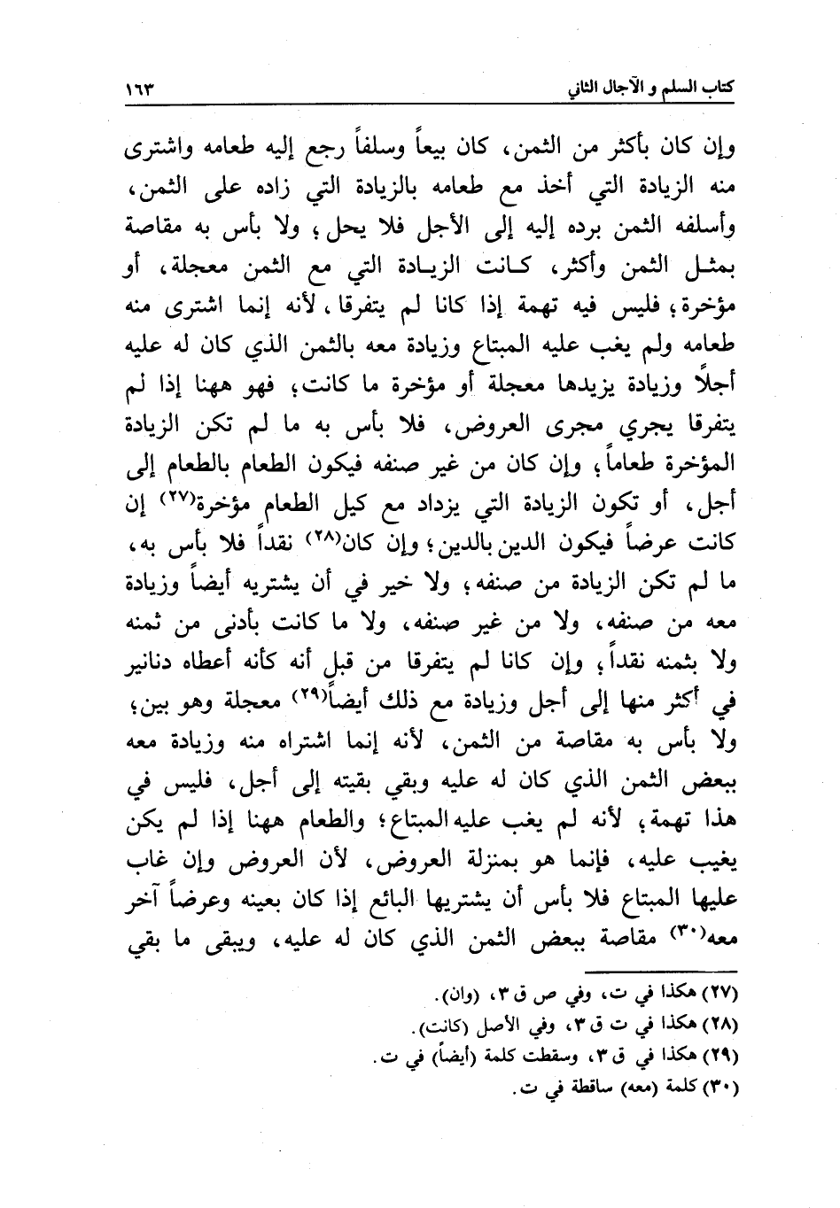 وإن كان بأكثر من الثمن، كان بيعا وسلفا رجع إليه طعامه واشترى منه الزيادة التي أخذ مع طعامه بالزيادة التي زاده على الثمن، وأسلفه الثمن برده إليه إلى الأجل فلا يحل؛ ولا بأس به مقاصة بمثل الثمن وأكثر، كانت الزيادة التي مع الثمن معجلة، أو مؤخرة؛ فليس فيه تهمة إذا كانا لم يتفرقا؛ لأنه إنما اشترى منه طعامه ولم يغب عليه المبتاع وزيادة معه بالثمن الذي كان له عليه أجلا وزيادة يزيدها معجلة أو مؤخرة ما كانت؛ فهو ههنا إذا لم يتفرقا يجري مجرى العروض، فلا بأس به ما لم تكن الزيادة المؤخرة طعاما؛ وإن كان من غير صنفه فيكون الطعام بالطعام إلى أجل، أو تكون الزيادة التي يزداد مع كيل الطعام مؤخرة إن كانت عرضا فيكون الدين بالدين؛ وإن كان نقدا فلا بأس به، ما لم تكن الزيادة من صنفه؛ ولا خير في أن يشتريه أيضا وزيادة معه من صنفه، ولا من غير صنفه، ولا ما كانت بأدنى من ثمنه ولا بثمنه نقدا؛ وإن كانا لم يتفرقا من قبل أنه كأنه أعطاه دنانير في أكثر منها إلى أجل وزيادة مع ذلك أيضا معجلة وهو بين؛ ولا بأس به مقاصة من الثمن؛ لأنه إنما اشتراه منه وزيادة معه ببعض الثمن الذي كان له عليه وبقي بقيته إلى أجل، فليس في هذا تهمة؛ لأنه لم يغب عليه المبتاع؛ والطعام ههنا إذا لم يكن يغيب عليه، فإنما هو بمنزلة العروض؛ لأن العروض وإن غاب عليها المبتاع فلا بأس أن يشتريها البائع إذا كان بعينه وعرضا آخر معه مقاصة ببعض الثمن الذي كان له عليه، ويبقى ما بقي