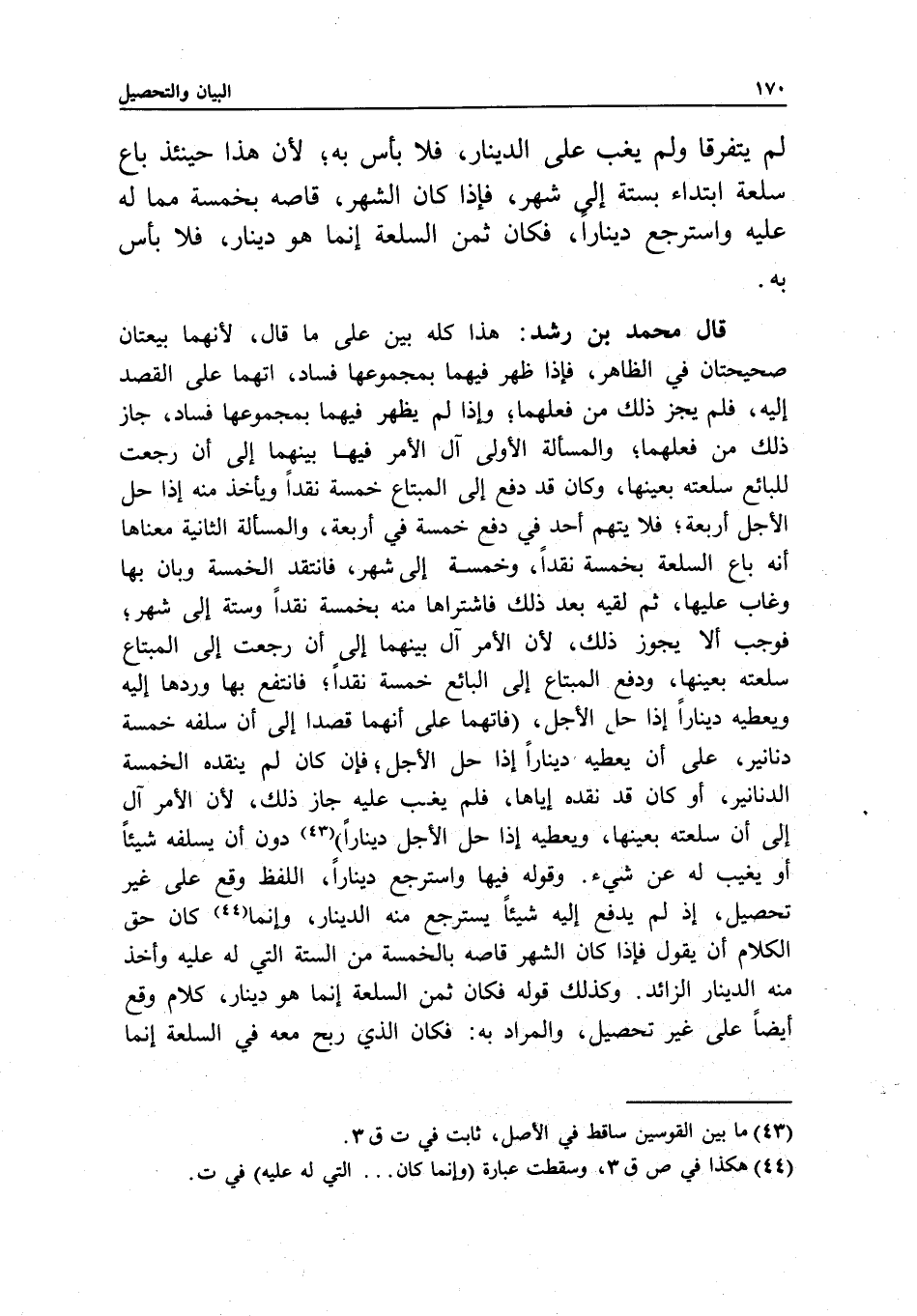 قال محمد بن رشد: هذا كله بين على ما قال؛ لأنهما بيعتان صحيحتان في الظاهر، فإذا ظهر فيهما بمجموعها فساد، اتهما على القصد إليه، فلم يجز ذلك من فعلهما؛ وإذا لم يظهر فيهما بمجموعها فساد، جاز ذلك من فعلهما؛ والمسألة الأولى آل الأمر فيها بينهما إلى أن رجعت للبائع سلعته بعينها، وكان قد دفع إلى المبتاع خمسة نقدا ويأخذ منه إذا حل الأجل أربعة؛ فلا يتهم أحد في دفع خمسة في أربعة، والمسألة الثانية معناها أنه باع السلعة بخمسة نقدا، وخمسة إلى شهر، فانتقد الخمسة وبان بها وغاب عليها، ثم لقيه بعد ذلك فاشتراها منه بخمسة نقدا وستة إلى شهر؛ فوجب ألا يجوز ذلك؛ لأن الأمر آل بينهما إلى أن رجعت إلى المبتاع سلعته بعينها، ودفع المبتاع إلى البائع خمسة نقدا؛ فانتفع بها وردها إليه ويعطيه دينارا إذا حل الأجل، فاتهما على أنهما قصدا إلى أن سلفه خمسة دنانير، على أن يعطيه دينارا إذا حل الأجل؛ فإن كان لم ينقده الخمسة الدنانير، أو كان قد نقده إياها، فلم يغب عليه جاز ذلك؛ لأن الأمر آل إلى أن سلعته بعينها، ويعطيه إذا حل الأجل دينارا دون أن يسلفه شيئا أو يغيب له عن شيء. وقوله فيها واسترجع دينارا، اللفظ وقع على غير تحصيل، إذ لم يدفع إليه شيئا يسترجع منه الدينار، وإنما كان حق الكلام أن يقول فإذا كان الشهر قاصه بالخمسة من الستة التي له عليه وأخذ منه الدينار الزائد. وكذلك قوله فكان ثمن السلعة إنما هو دينار، كلام وقع أيضا على غير تحصيل، والمراد به: فكان الذي ربح معه في السلعة إنما