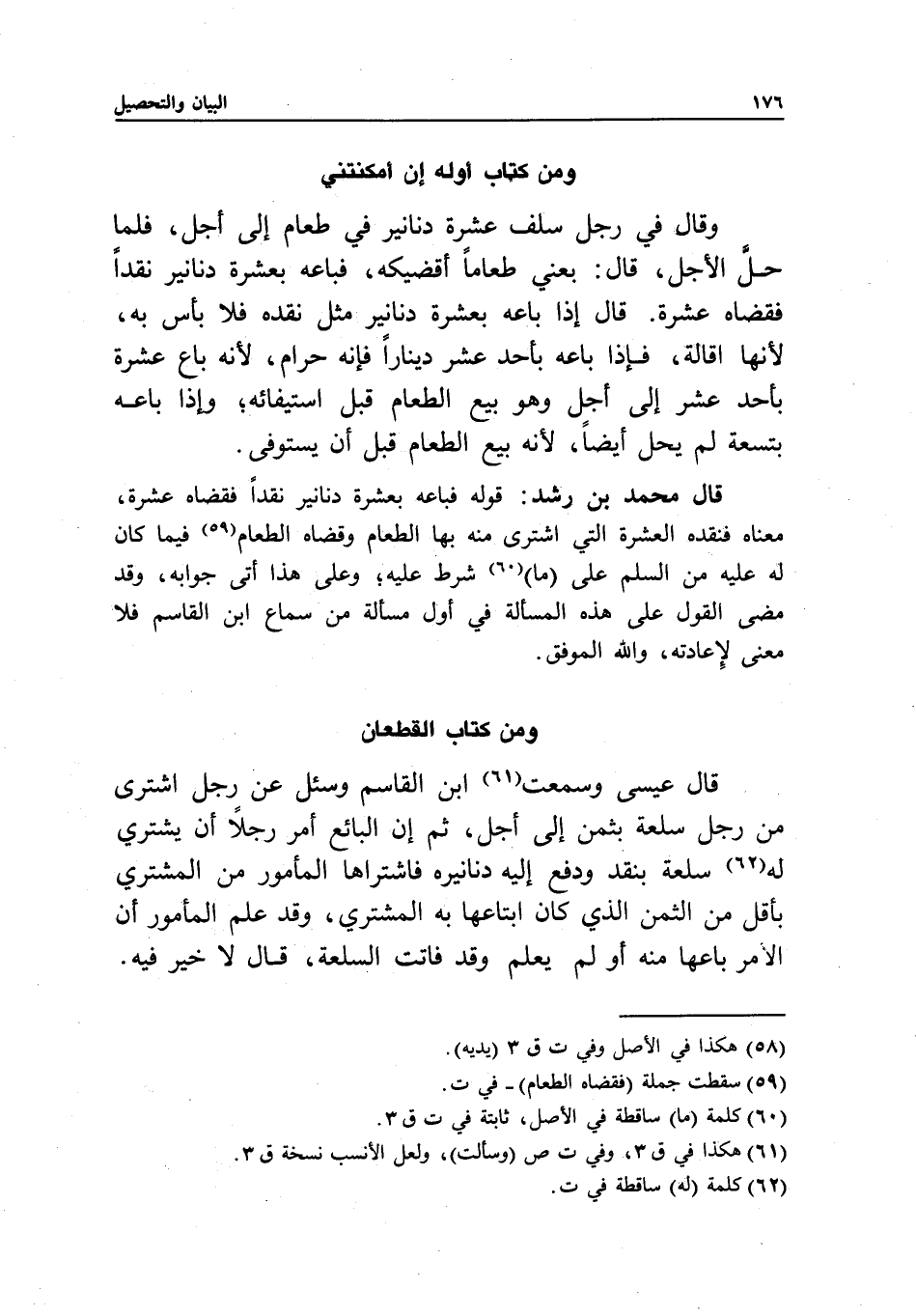 ومن كتاب أوله إن أمكنتني وقال في رجل سلف عشرة دنانير في طعام إلى أجل، فلما حل الأجل، قال: بعني طعاما أقضيكه، فباعه بعشرة دنانير نقدا فقضاه عشرة. قال إذا باعه بعشرة دنانير مثل نقده فلا بأس به؛ لأنها إقالة، فإذا باعه بأحد عشر دينارا فإنه حرام؛ لأنه باع عشرة بأحد عشر إلى أجل وهو بيع الطعام قبل استيفائه؛ وإذا باعه بتسعة لم يحل أيضا؛ لأنه بيع الطعام قبل أن يستوفى.
