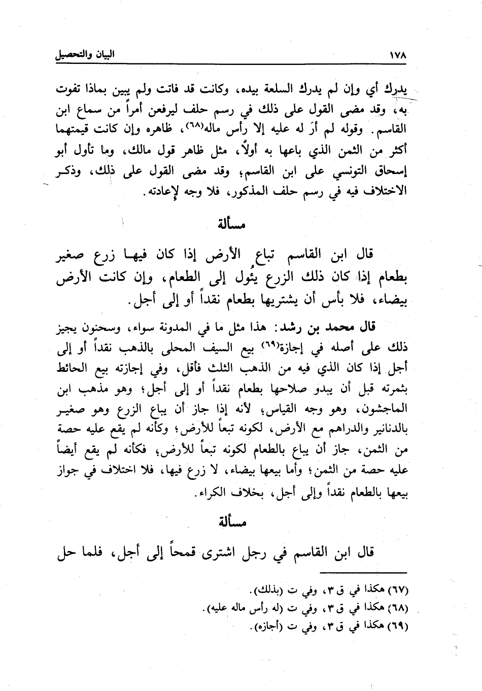قال محمد بن رشد: هذا مثل ما في المدونة سواء، وسحنون يجيز ذلك على أصله في إجازة بيع السيف المحلى بالذهب نقدا أو إلى أجل إذا كان الذي فيه من الذهب الثلث فأقل، وفي إجازته بيع الحائط بثمرته قبل أن يبدو صلاحها بطعام نقدا أو إلى أجل؛ وهو مذهب ابن الماجشون، وهو وجه القياس؛ لأنه إذا جاز أن يباع الزرع وهو صغير بالدنانير والدراهم مع الأرض، لكونه تبعا للأرض؛ وكأنه لم يقع عليه حصة من الثمن، جاز أن يباع بالطعام لكونه تبعا للأرض؛ فكأنه لم يقع أيضا عليه حصة من الثمن؛ وأما بيعها بيضاء، لا زرع فيها، فلا اختلاف في جواز بيعها بالطعام نقدا وإلى أجل، بخلاف الكراء.