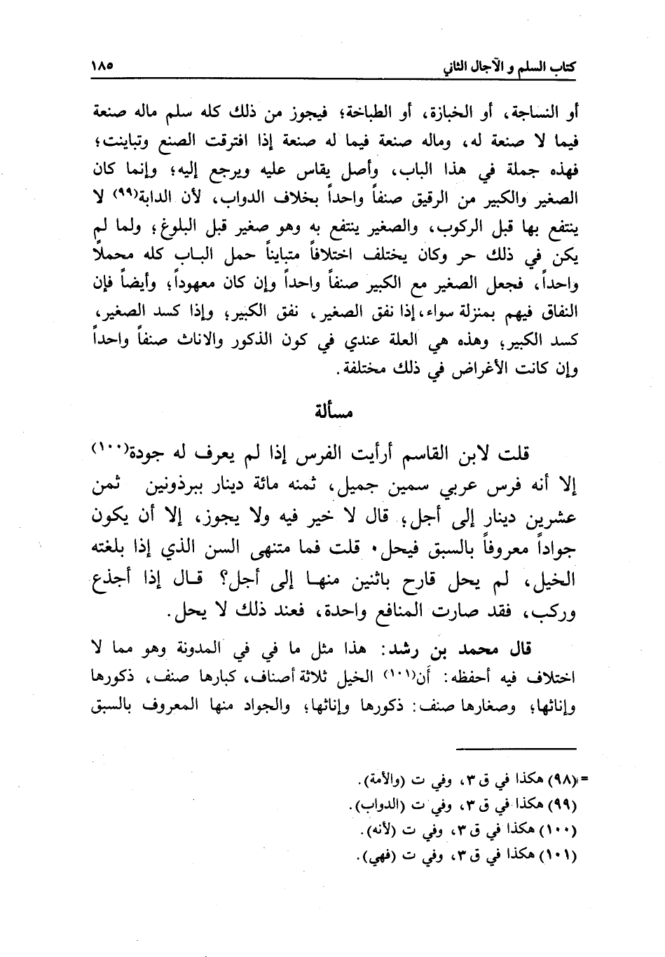 مسألة قلت لابن القاسم أرأيت الفرس إذا لم يعرف له جودة إلا أنه فرس عربي سمين جميل، ثمنه مائة دينار ببرذونين ثمن عشرين دينارا إلى أجل؛ قال لا خير فيه ولا يجوز، إلا أن يكون جوادا معروفا بالسبق فيحل. قلت فما متنهى السن الذي إذا بلغته الخيل، لم يحل قارح باثنين منها إلى أجل؟ قال إذا أجذع وركب، فقد صارت المنافع واحدة، فعند ذلك لا يحل.