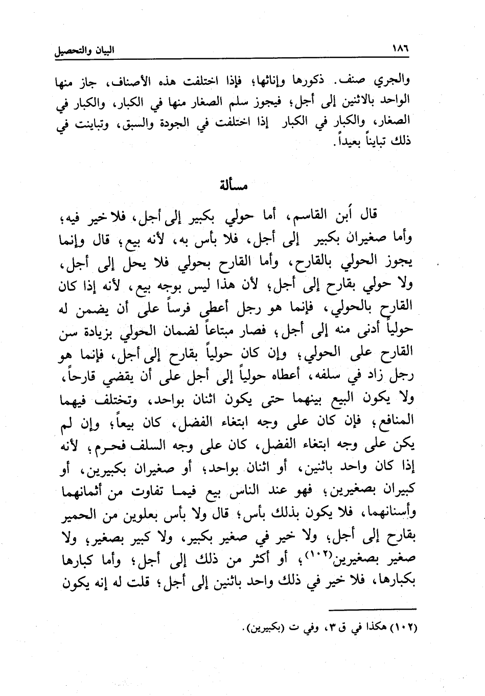 مسألة قال ابن القاسم، أما حولي بكبير إلى أجل، فلا خير فيه؛ وأما صغيران بكبير إلى أجل، فلا بأس به؛ لأنه بيع؛ قال وإنما يجوز الحولي بالقارح، وأما القارح بحولي فلا يحل إلى أجل، ولا حولي بقارح إلى أجل؛ لأن هذا ليس بوجه بيع؛ لأنه إذا كان القارح بالحولي، فإنما هو رجل أعطى فرسا على أن يضمن له حوليا أدنى منه إلى أجل؛ فصار مبتاعا لضمان الحولي بزيادة سن القارح على الحولي؛ وإن كان حوليا بقارح إلى أجل، فإنما هو رجل زاد في سلفه، أعطاه حوليا إلى أجل على أن يقضي قارحا، ولا يكون البيع بينهما حتى يكون اثنان بواحد، وتختلف فيهما المنافع؛ فإن كان على وجه ابتغاء الفضل، كان بيعا؛ وإن لم يكن على وجه ابتغاء الفضل، كان على وجه السلف فحرم؛ لأنه إذا كان واحد باثنين، أو اثنان بواحد؛ أو صغيران بكبيرين، أو كبيران بصغيرين؛ فهو عند الناس بيع فيما تفاوت من أثمانهما وأسنانهما، فلا يكون بذلك بأس؛ قال ولا بأس بعلوين من الحمير بقارح إلى أجل؛ ولا خير في صغير بكبير، ولا كبير بصغير؛ ولا صغير بصغيرين؛ أو أكثر من ذلك إلى أجل؛ وأما كبارها بكبارها، فلا خير في ذلك واحد باثنين إلى أجل؛ قلت له إنه يكون