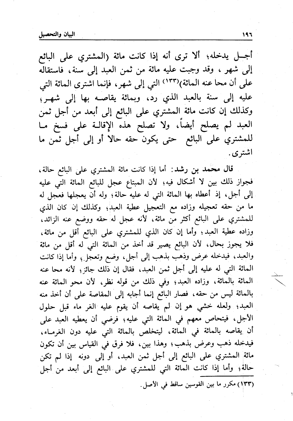 قال محمد بن رشد: أما إذا كانت مائة المشتري على البائع حالة، فجواز ذلك بين لا أشكال فيه؛ لأن المبتاع عجل للبائع المائة التي عليه إلى أجل، إذ أعطاه بها المائة التي له عليه حالة؛ وله أن يعجلها فعجل له ما من حقه تعجيله وزاده مع التعجيل عطية العبد، وكذلك إن كان الذي للمشتري على المائع أكثر من مائة؛ لأنه عجل له حقه ووضع عنه الزائد، وزاده عطية العبد، وأما إن كان الذي للمشتري على البائع أقل من مائة، فلا يجوز بحال؛ لأن البائع يصير قد أخذ من المائة التي له أقل من مائة والعبد، فيدخله عرض وذهب بذهب إلى أجل، وضع وتعجل؛ وأما إذا كانت المائة التي له عليه إلى أجل ثمن العبد، فقال إن ذلك جائز؛ لأنه محا عنه المائة بالمائة، وزاده العبد؛ وفي ذلك من قوله نظر؛ لأن محو المائة عنه بالمائة ليس من حقه، فصار البائع إنما أجابه إلى المقاصة على أن أخذ منه العبد؛ ولعله خشي هو إن لم يقاصه أن يقوم عليه الغر ماء قبل حلول الأجل، فيتحاص معهم في المائة التي عليه؛ فرضي أن يعطيه العبد على أن يقاصه بالمائة في المائة، ليتخلص بالمائة التي عليه دون الغرماء، فيدخله ذهب وعرض بذهب؛ وهذا بين، فلا فرق في القياس بين أن تكون مائة المشتري على البائع إلى أجل ثمن العبد، أو إلى دونه إذا لم تكن حالة؛ وأما إذا كانت المائة التي للمشتري على البائع إلى أبعد من أجل