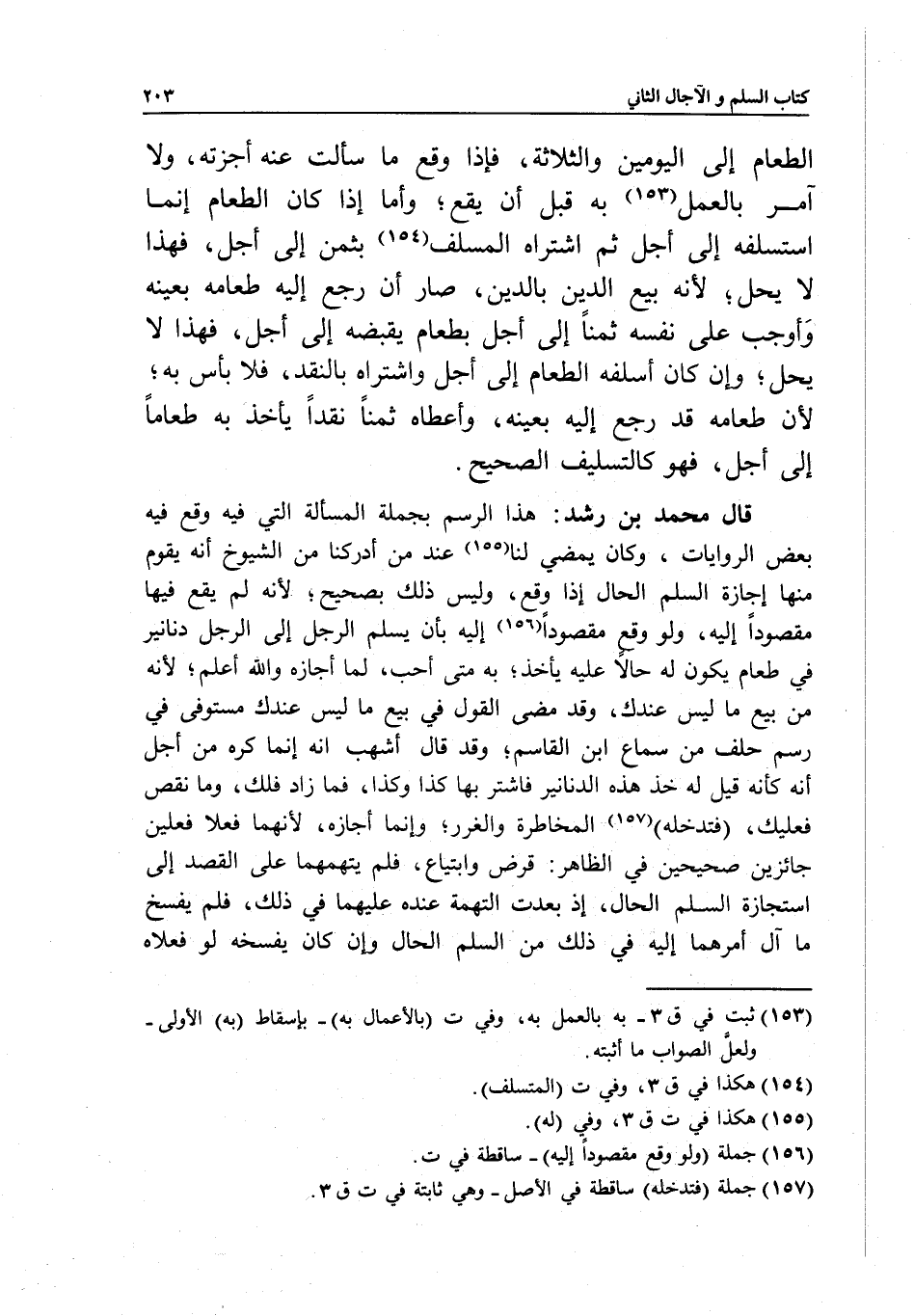 الطعام إلى اليومين والثلاثة، فإذا وقع ما سألت عنه أجزته، ولا آمر بالعمل به قبل أن يقع؛ وأما إذا كان الطعام إنما استسلفه إلى أجل ثم اشتراه المسلف بثمن إلى أجل، فهذا لا يحل؛ لأنه بيع الدين بالدين، صار أن رجع إليه طعامه بعينه وأوجب على نفسه ثمنا إلى أجل بطعام يقبضه إلى أجل، فهذا لا يحل؛ وإن كان أسلفه الطعام إلى أجل واشتراه بالنقد، فلا بأس به؛ لأن طعامه قد رجع إليه بعينه، وأعطاه ثمنا نقدا يأخذ به طعاما إلى أجل، فهو كالتسليف الصحيح.