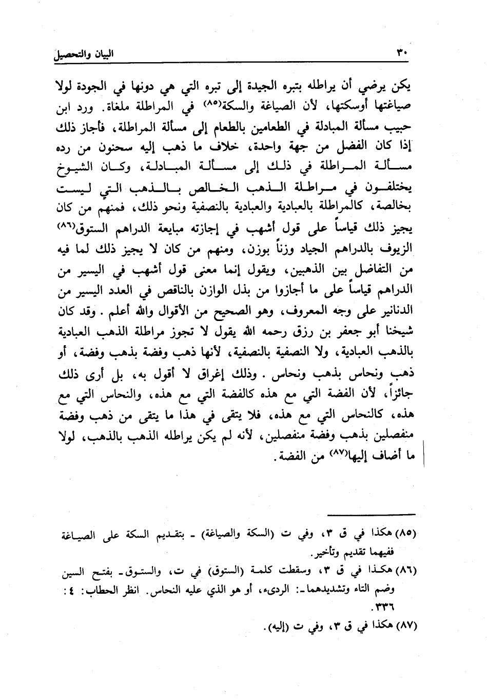 يكن يرضي أن يراطله بتبره الجيدة إلى تبره التي هي دونها في الجودة لولا صياغتها أو سكتها؛ لأن الصياغة والسكة في المراطلة ملغاة. ورد ابن حبيب مسألة المبادلة في الطعامين بالطعام إلى مسألة المراطلة، فأجاز ذلك إذا كان الفضل من جهة واحدة، خلاف ما ذهب إليه سحنون من رده مسألة المراطلة في ذلك إلى مسألة المبادلة، وكان الشيوخ يختلفون في مراطلة الذهب الخالص بالذهب التي ليست بخالصة، كالمراطلة بالعبادية والعبادية بالنصفية ونحو ذلك، فمنهم من كان يجيز ذلك قياسا على قول أشهب في إجازته مبايعة الدراهم الستوق الزيوف بالدراهم الجياد وزنا بوزن، ومنهم من كان لا يجيز ذلك لما فيه من التفاضل بين الذهبين، ويقول: إنما معنى قول أشهب في اليسير من الدراهم قياسا على ما أجازوا من بذل الوازن بالناقص في العدد اليسير من الدنانير على وجه المعروف، وهو الصحيح من الأقوال والله أعلم.