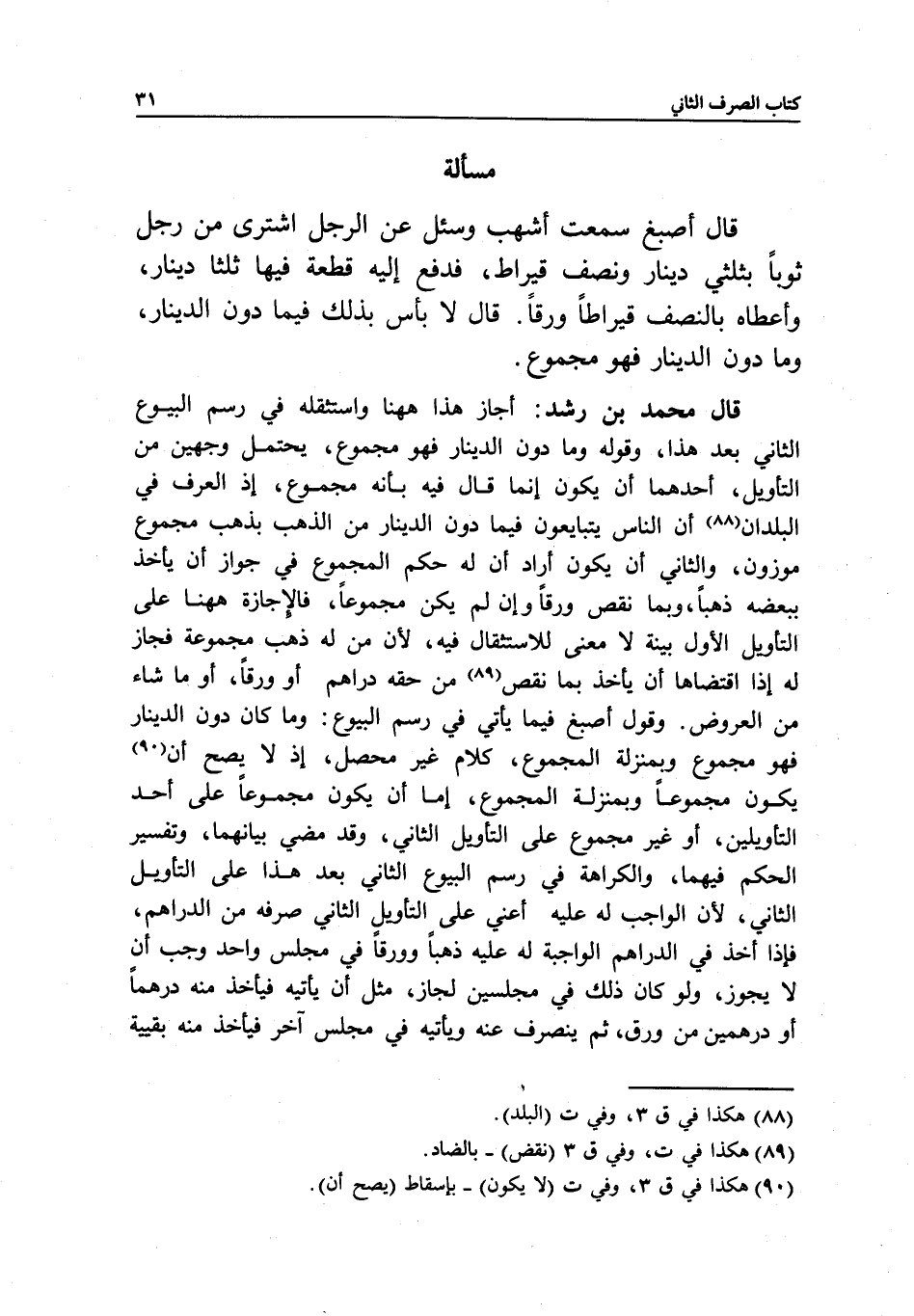 وقول أصبغ فيما يأتي في رسم البيوع: وما كان دون الدينار فهو مجموع وبمنزلة المجموع، كلام غير محصل، إذ لا يصح أن يكون مجموعا وبمنزلة المجموع، إما أن يكون مجموعا على أحد التأويلين، أو غير مجموع على التأويل الثاني، وقد مضي بيانهما، وتفسير الحكم فيهما، والكراهة في رسم البيوع الثاني بعد هذا على التأويل الثاني؛ لأن الواجب له عليه أعني على التأويل الثاني صرفه من الدراهم، فإذا أخذ في الدراهم الواجبة له عليه ذهبا وورقا في مجلس واحد وجب أن لا يجوز، ولو كان ذلك في مجلسين لجاز، مثل أن يأتيه فيأخذ منه درهما أو درهمين من ورق، ثم ينصرف عنه ويأتيه في مجلس آخر فيأخذ منه بقية