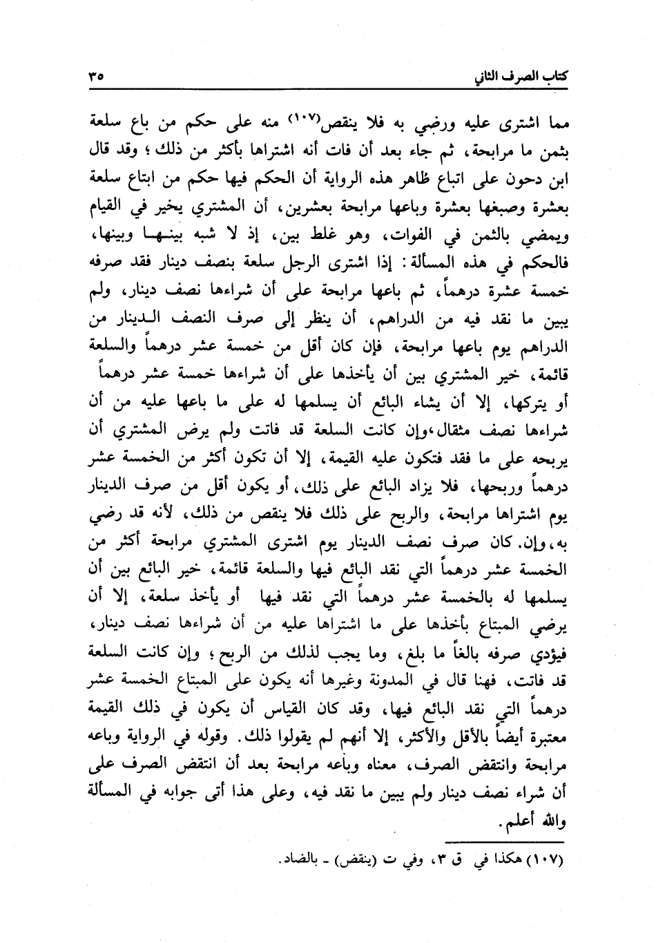 مما اشترى عليه ورضي به فلا ينقص منه على حكم من باع سلعة بثمن ما مرابحة، ثم جاء بعد أن فات أنه اشتراها بأكثر من ذلك. وقد قال ابن دحون على إتباع ظاهر هذه الرواية أن الحكم فيها حكم من ابتاع سلعة بعشرة وصبغها بعشرة وباعها مرابحة بعشرين: إن المشتري يخير في القيام ويمضي بالثمن في الفوات، وهو غلط بين، إذ لا شبه بينها وبينها، فالحكم في هذه المسألة: إذا اشترى الرجل سلعة بنصف دينار فقد صرفه خمسة عشرة درهما، ثم باعها مرابحة على أن شراءها نصف دينار، ولم يبين ما نقد فيه من الدراهم، أن ينظر إلى صرف النصف الدينار من الدراهم يوم باعها مرابحة، فإن كان أقل من خمسة عشر درهما والسلعة قائمة، خير المشتري بين أن يأخذها على أن شراءها خمسة عشر درهما أو يتركها، إلا أن يشاء البائع أن يسلمها له على ما باعها عليه من أن شراءها نصف مثقال، وإن كانت السلعة قد فاتت ولم يرض المشتري أن يربحه على ما فقد فتكون عليه القيمة، إلا أن تكون أكثر من الخمسة عشر درهما وربحها، فلا يزاد البائع على ذلك، أو يكون أقل من صرف الدينار يوم اشتراها مرابحة، والربح على ذلك فلا ينقص من ذلك؛ لأنه قد رضي به، وإن كان صرف نصف الدينار يوم اشترى المشتري مرابحة أكثر من الخمسة عشر درهما التي نقد البائع فيها والسلعة قائمة، خير البائع بين أن يسلمها له بالخمسة عشر درهما التي نقد فيها أو يأخذ سلعة، إلا أن يرضى المبتاع بأخذها على ما اشتراها عليه من أن شراءها نصف دينار، فيؤدي صرفه بالغا ما بلغ، وما يجب لذلك من الربح؛ وإن كانت السلعة قد فاتت، فهنا قال في المدونة وغيرها: إنه يكون على المبتاع الخمسة عشر درهما التي نقد البائع فيها، وقد كان القياس أن يكون في ذلك القيمة معتبرة أيضا بالأقل والأكثر، إلا أنهم لم يقولوا ذلك. وقوله في الرواية: وباعه مرابحة وانتقض الصرف، معناه: وباعه مرابحة بعد أن انتقض الصرف على أن شراء نصف دينار ولم يبين ما نقد فيه، وعلى هذا أتى جوابه في المسألة، والله أعلم.