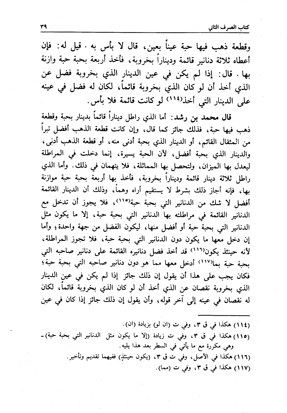 قال محمد بن رشد: أما الذي راطل دينارا قائما بدينار بحبة وقطعة ذهب فيها حبة، فذلك جائز كما قال، وإن كانت قطعة الذهب أفضل تبرا من المثقال القائم، أو الدينار الذي بحبة أدنى منه، أو قطعة الذهب أدنى، والدينار الذي بحبة أفضل؛ لأن الحبة يسيرة، إنما دخلت في المراطلة ليعدل بها الميزان، ولتحصل بها المماثلة، فلا يتهمان في ذلك. وأما الذي راطل ثلاثة دينار قائمة ودينارا بخروبة، فأخذ بها أربعة بحبة حبة موازنة بها، فإنه أجاز ذلك بشرط لا يستقيم أراه وهما، وذلك أن الدينار القائمة أفضل لا شك من الدنانير التي بحبة حبة، فلا يجوز أن تدخل مع الدنانير القائمة في مراطلته بها الدنانير التي بحبة حبة، إلا ما يكون مثل الدنانير التي بحبة حبة أو أفضل منها، ليكون الفضل من جهة واحدة؛ وأما إن دخل معها ما يكون دون الدنانير التي بحبة حبة، فلا تجوز المراطلة؛ لأنه حينئذ يكون قد أخذ فضل دنانيره القائمة على دنانير صاحبه التي بحبة حبة بما أدخل معها مما هو دون دنانير صاحبه التي بحبة حبة؛ فكان يجب على هذا أن يقول: إن ذلك جائز إذا لم يكن في عين الدينار الذي بخروبة نقصان عن الذي أخذ أن لو كان الذي بخروبة قائما، لكان له نقصان في عينه ... إلى آخر قوله، وأن يقول: إن ذلك جائز إذا كان في عين