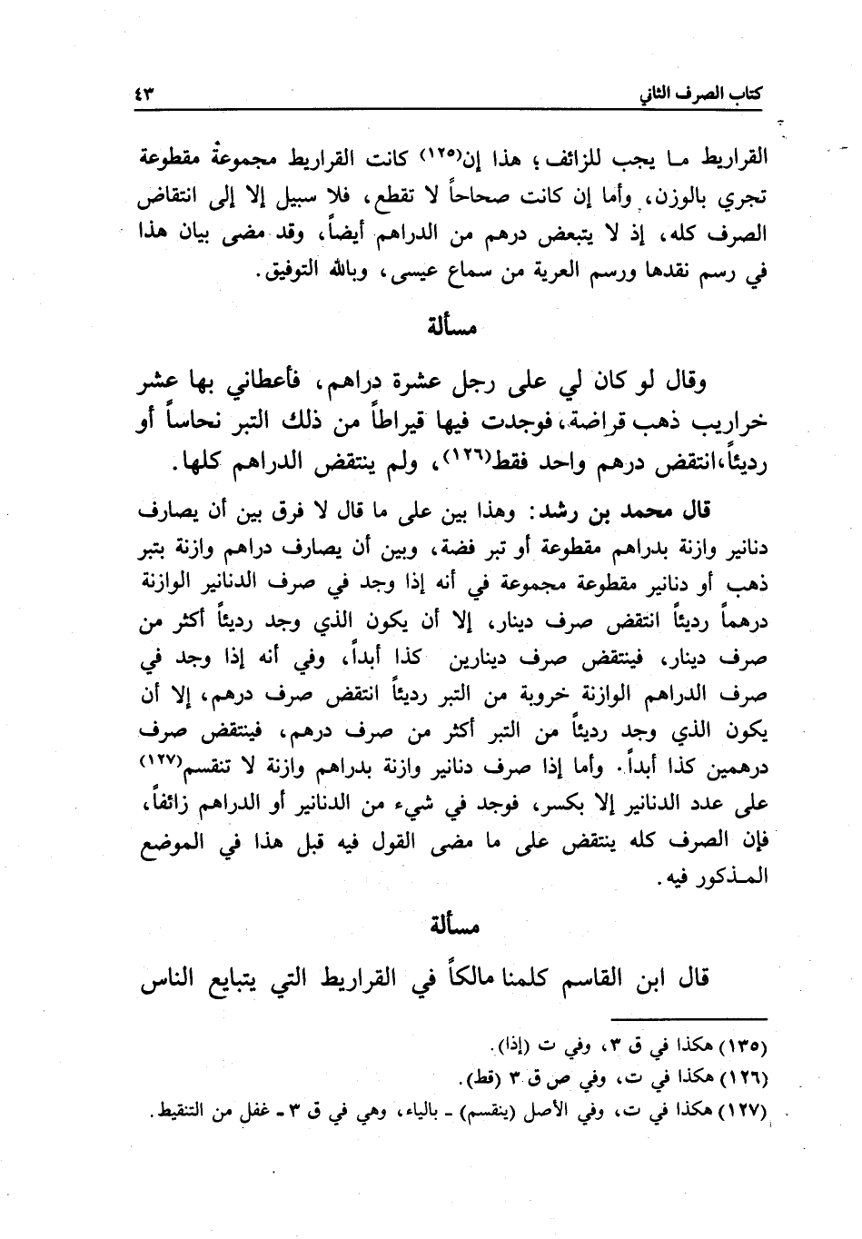 قال محمد بن رشد: وهذا بين على ما قال لا فرق بين أن يصارف دنانير وازنة بدراهم مقطوعة أو تبر فضة، وبين أن يصارف دراهم وازنة بتبر ذهب أو دنانير مقطوعة مجموعة في أنه إذا وجد في صرف الدنانير الوازنة درهما رديئا انتقض صرف دينار، إلا أن يكون الذي وجد رديئا أكثر من صرف دينار، فينتقض صرف دينارين كذا أبدا، وفي أنه إذا وجد في صرف الدراهم الوازنة خروبة من التبر رديئا انتقض صرف درهم، إلا أن يكون الذي وجد رديئا من التبر أكثر من صرف درهم، فينتقض صرف درهمين كذا أبدا. وأما إذا صرف دنانير وازنة بدراهم وازنة لا تنقسم على عدد الدنانير إلا بكسر، فوجد في شيء من الدنانير أو الدراهم زائفا، فإن الصرف كله ينتقض على ما مضى القول فيه قبل هذا في الموضع المذكور فيه.