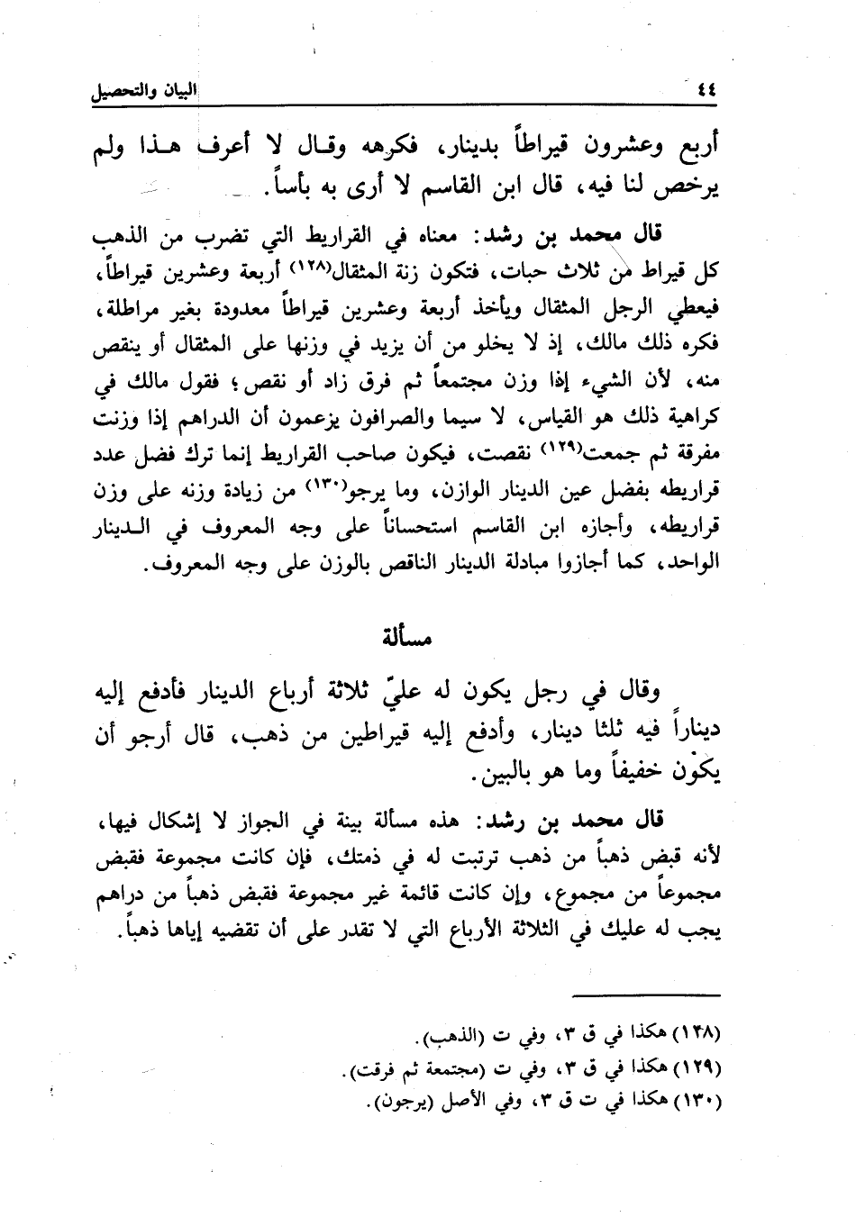 قال محمد بن رشد: معناه في القراريط التي تضرب من الذهب كل قيراط من ثلاث حبات، فتكون زنة المثقال أربعة وعشرين قيراطا، فيعطي الرجل المثقال ويأخذ أربعة وعشرين قيراطا معدودة بغير مراطلة، فكره ذلك مالك، إذ لا يخلو من أن يزيد في وزنها على المثقال أو ينقص منه؛ لأن الشيء إذا وزن مجتمعا ثم فرق زاد أو نقص؛ فقول مالك في كراهية ذلك هو القياس، لا سيما والصرافون يزعمون أن الدراهم إذا وزنت مفرقة ثم جمعت نقصت، فيكون صاحب القراريط إنما ترك فضل عدد قراريطه بفضل عين الدينار الوازن، وما يرجو من زيادة وزنه على وزن قراريطه، وأجازه ابن القاسم استحسانا على وجه المعروف في الدينار الواحد، كما أجازوا مبادلة الدينار الناقص بالوزن على وجه المعروف.
