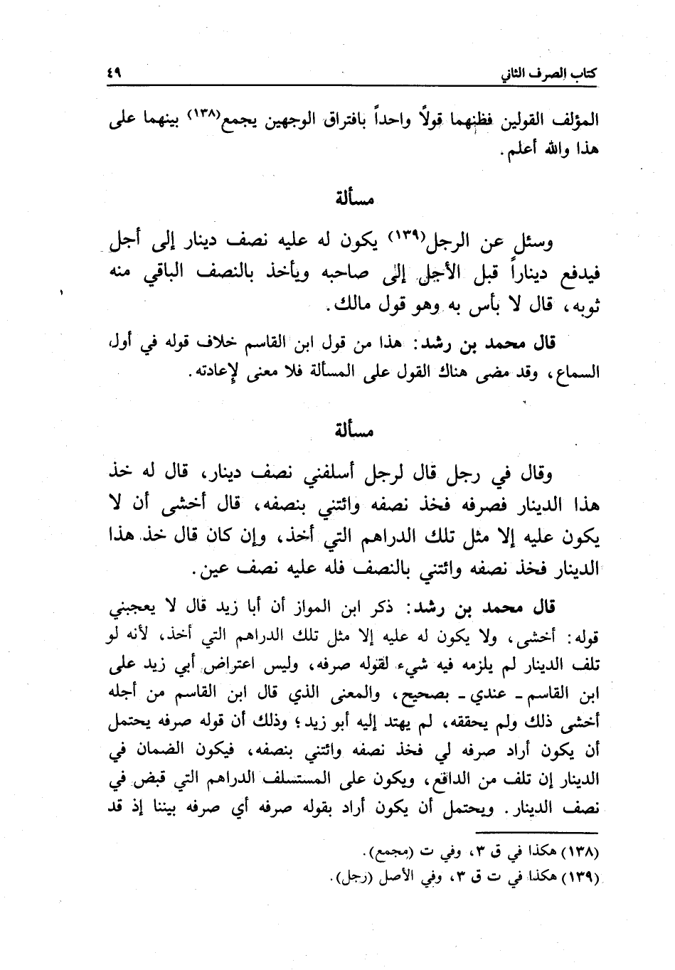 قار! محمد بن رشد: ذكر ابن المواز أن أبا زيد قال: لا يعجبني قوله: أخشى، ولا يكون له عليه إلا مثل تلك الدراهم التي أخذ؛ لأنه لو تلف الدينار لم يلزمه فيه شيء لقوله صرفه، وليس اعتراض أبي زيد على ابن القاسم -عندي- بصحيح، والمعنى الذي قال ابن القاسم من أجله أخشى ذلك ولم يحققه، لم يهتد إليه أبو زيد، وذلك أن قوله صرفه يحتمل أن يكون أراد صرفه لي فخذ نصفه وائتني بنصفه، فيكون الضمان في الدينار إن تلف من الدافع، ويكون على المستسلف الدراهم التي قبض في نصف الدينار. ويحتمل أن يكون أراد بقوله صرفه أي صرفه بيننا إذ قد