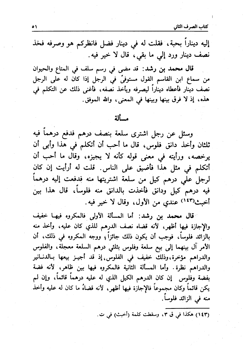 مسألة وسئل: عن رجل اشترى سلعة بنصف درهم فدفع درهما فيه ثلثان وأخذ دانق فلوس، قال: ما أحب أن أتكلم في هذا، وأبى أن يرخصه، ورأيته في معنى قوله كأنه لا يجيزه، وقال: ما أحب أن أتكلم في مثل هذا فأضيق على الناس.