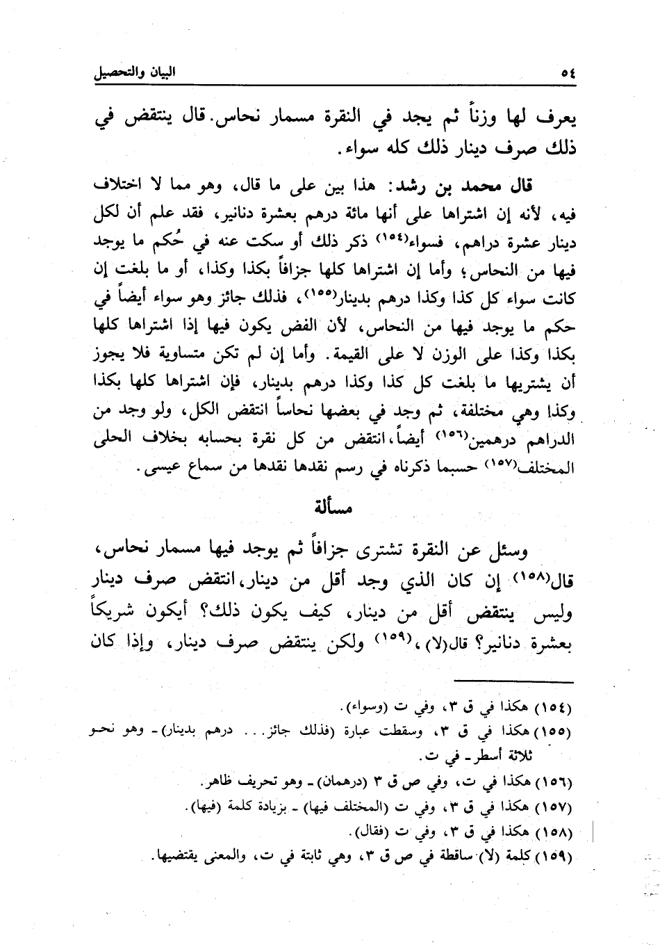 قال محمد بن رشد: هذا بين على ما قال، وهو مما لا اختلاف فيه؛ لأنه إن اشتراها على أنها مائة درهم بعشرة دنانير، فقد علم أن لكل دينار عشرة دراهم، فسواء ذكر ذلك أو سكت عنه في حكم ما يوجد فيها من النحاس؛ وأما إن اشتراها كلها جزافا بكذا وكذا، أو ما بلغت إن كانت سواء كل كذا وكذا درهم بدينار، فذلك جائز وهو سواء أيضا في حكم ما يوجد فيها من النحاس؛ لأن الفض يكون فيها إذا اشتراها كلها بكذا وكذا على الوزن لا على القيمة. وأما إن لم تكن متساوية فلا يجوز أن يشتريها ما بلغت كل كذا وكذا درهم بدينار، فإن اشتراها كلها بكذا وكذا وهي مختلفة، ثم وجد في بعضها نحاسا انتقض الكل، ولو وجد من الدراهم درهمين أيضا، انتقض من كل نقرة بحسابه بخلاف الحلي المختلف حسبما ذكرناه في رسم نقدها نقدها من سماع عيسى.