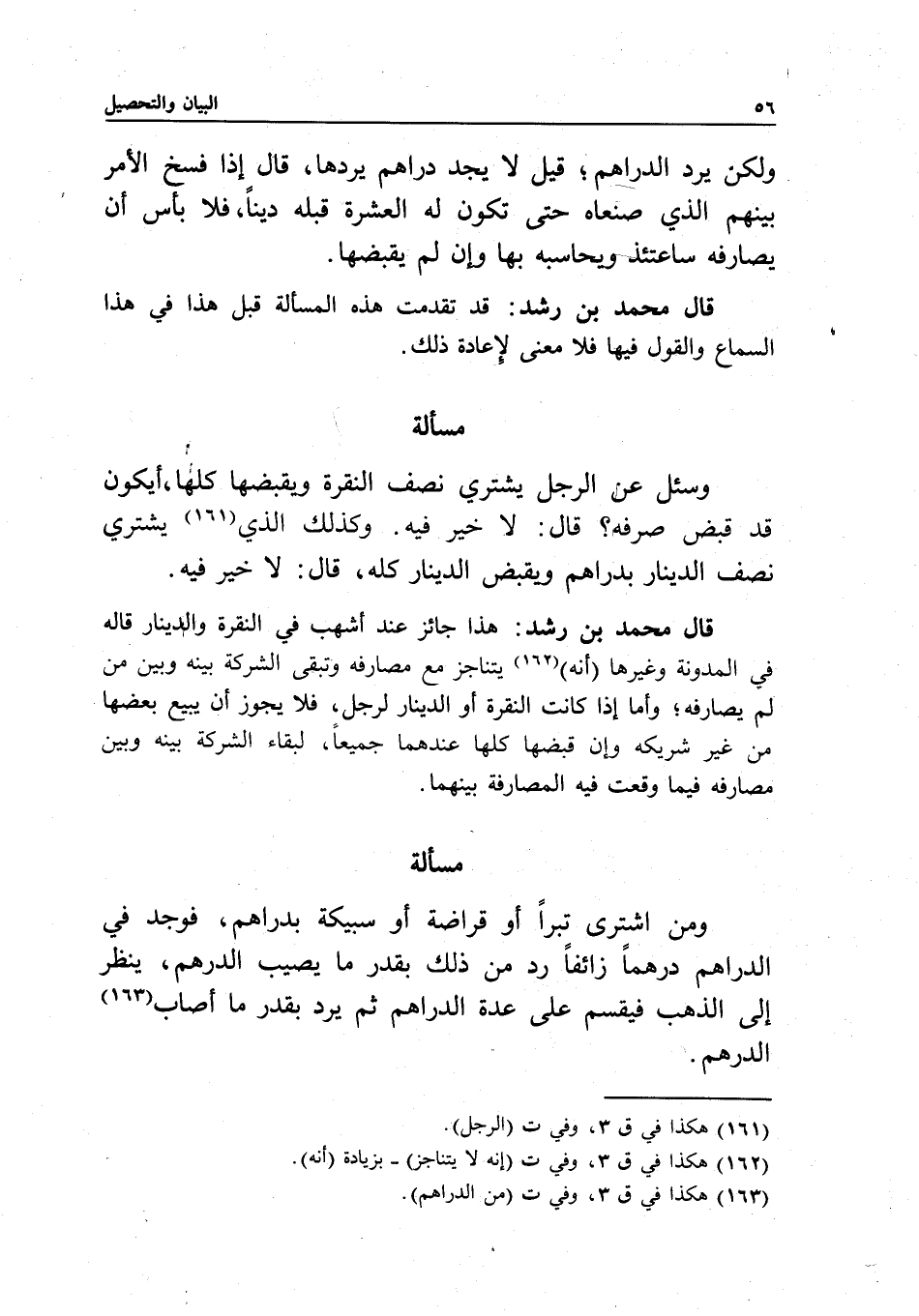 مسألة وسئل: عن الرجل يشتري نصف النقرة ويقبضها كلها، أيكون قد قبض صرفه؟ قال: لا خير فيه. وكذلك الذي يشتري نصف الدينار بدراهم ويقبض الدينار كله، قال: لا خير فيه.