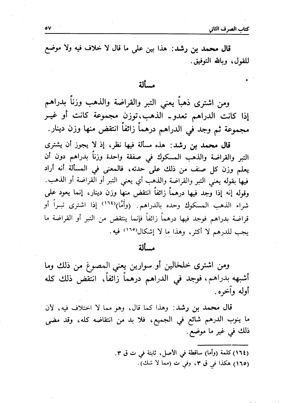 قال محمد بن رشد: هذه مسألة فيها نظر، إذ لا يجوز أن يشترى التبر والقراضة والذهب المسكوك في صفقة واحدة وَزْنًا بدراهم دون أن يعلم وزن كل صنف من ذلك على حدته، فالمعنى في المسألة أنه أراد فيها بقوله يعني التبر والقراضة والذهب، أي يعني التبر أو القراضة أو الذهب.
